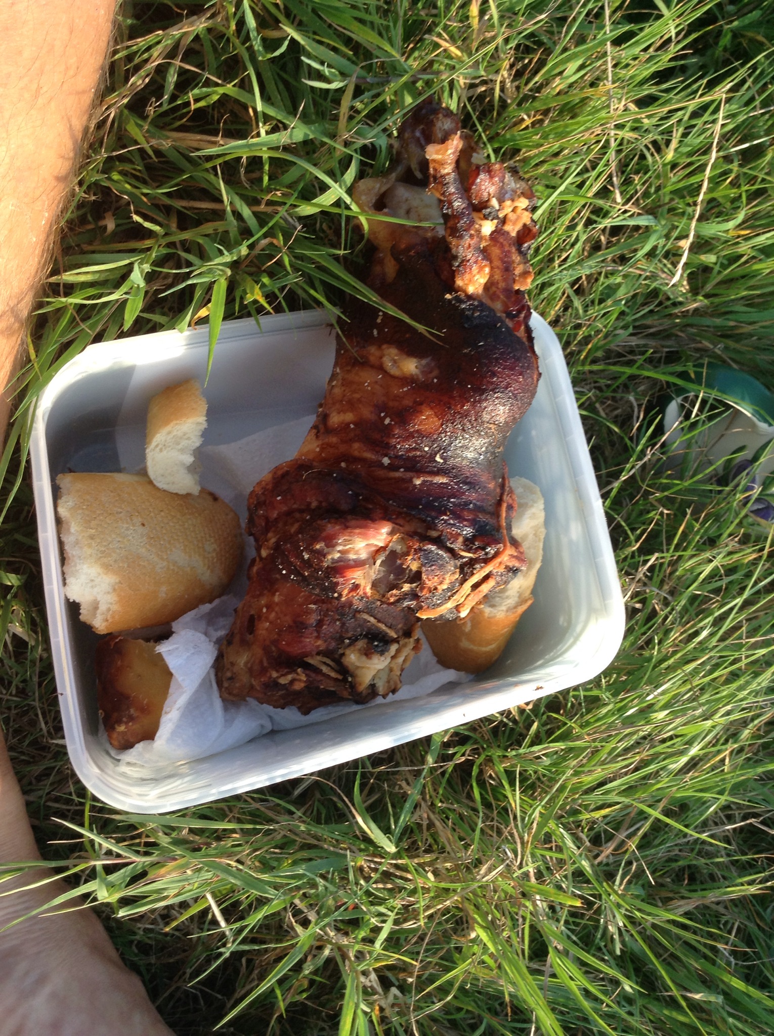 A young couple were just strapping their baby into a car seat and I asked if they were going to try the submerged road or go the other way (my way). They confirmed they were going my way, to the village I was aiming for in fact, and I asked for a lift. They were ok with it and I got a much needed assist. The camp site is a working farm and when the owner clocked my shirt and I confirmed that I was doing a charity walk for H4H he wouldn’t take any money. I’m staying two nights as I now need to backtrack tomorrow to cover the missed miles but he won’t take any fee. Thank you Mount Folly Farm. Not only that, he could see I was knackered and whilst I was setting up Wilson he brought over a cup of tea and a bowl of lamb slices, a ham hock, bread and a tomato. They’d had a hog roast yesterday and there was some left over!