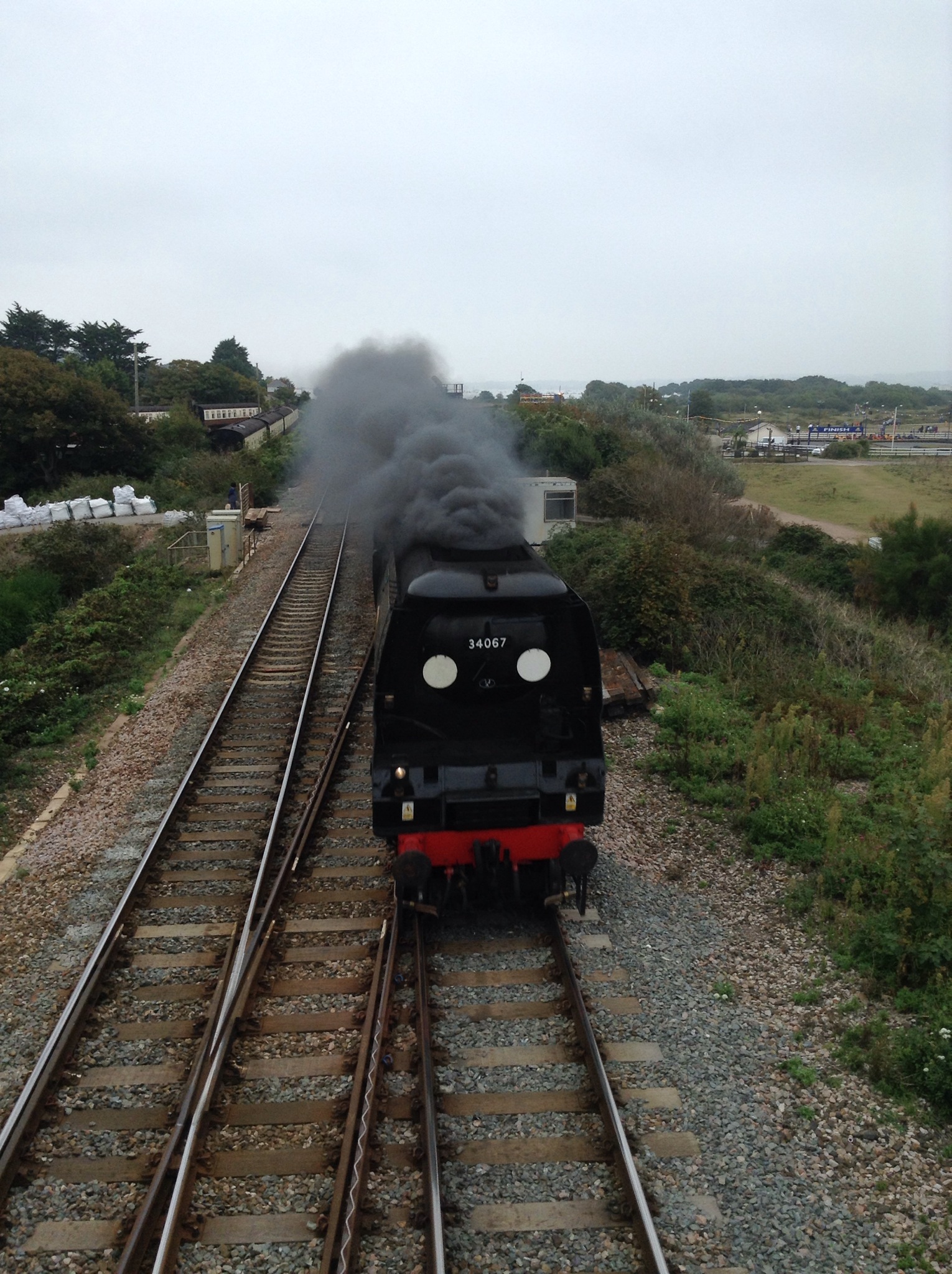 Cloudy and cool this morning. As I walked alongside the rail line there were suddenly loads of people, waiting to see an old, but very fast, steam train. Here it is.
