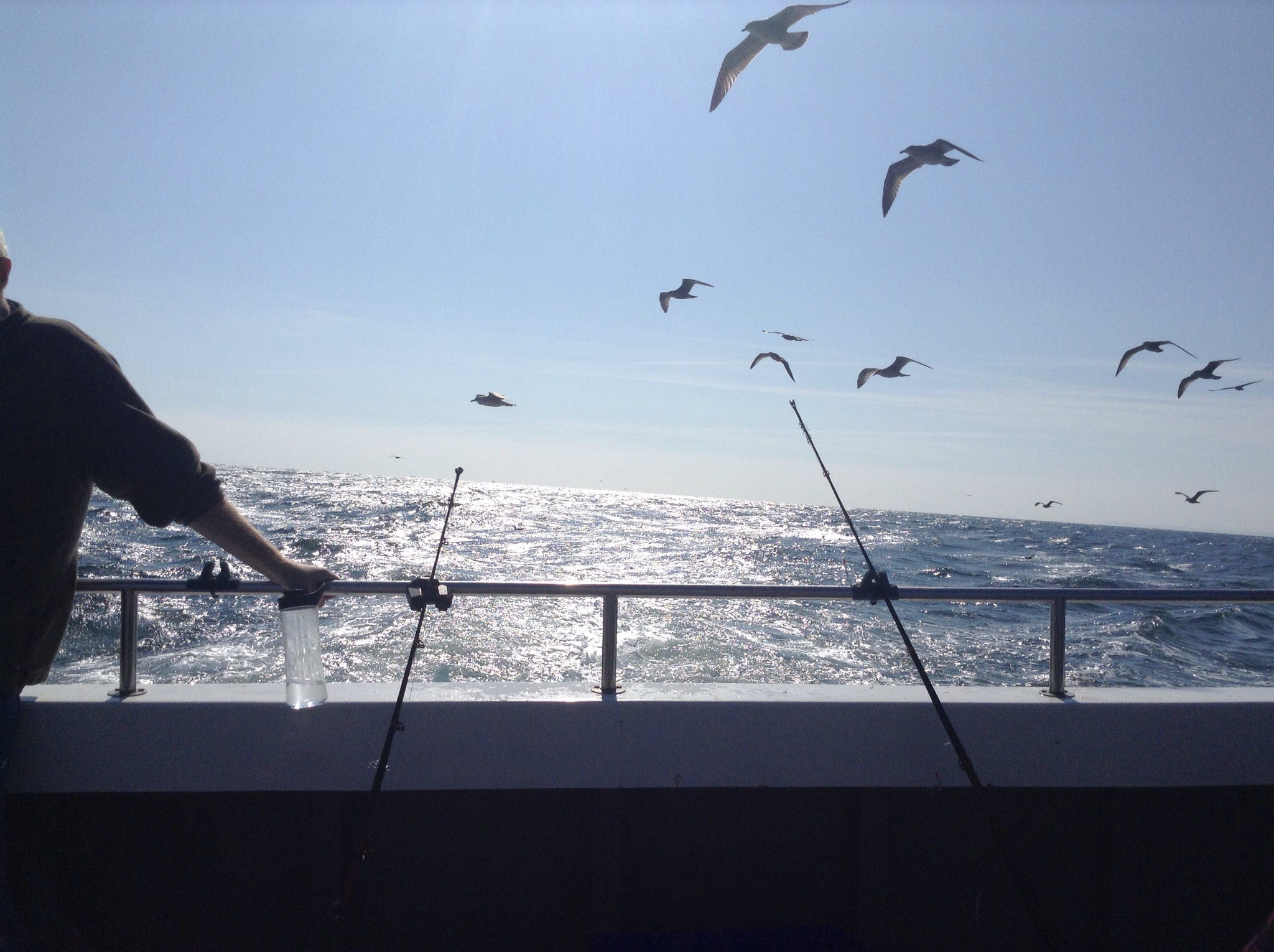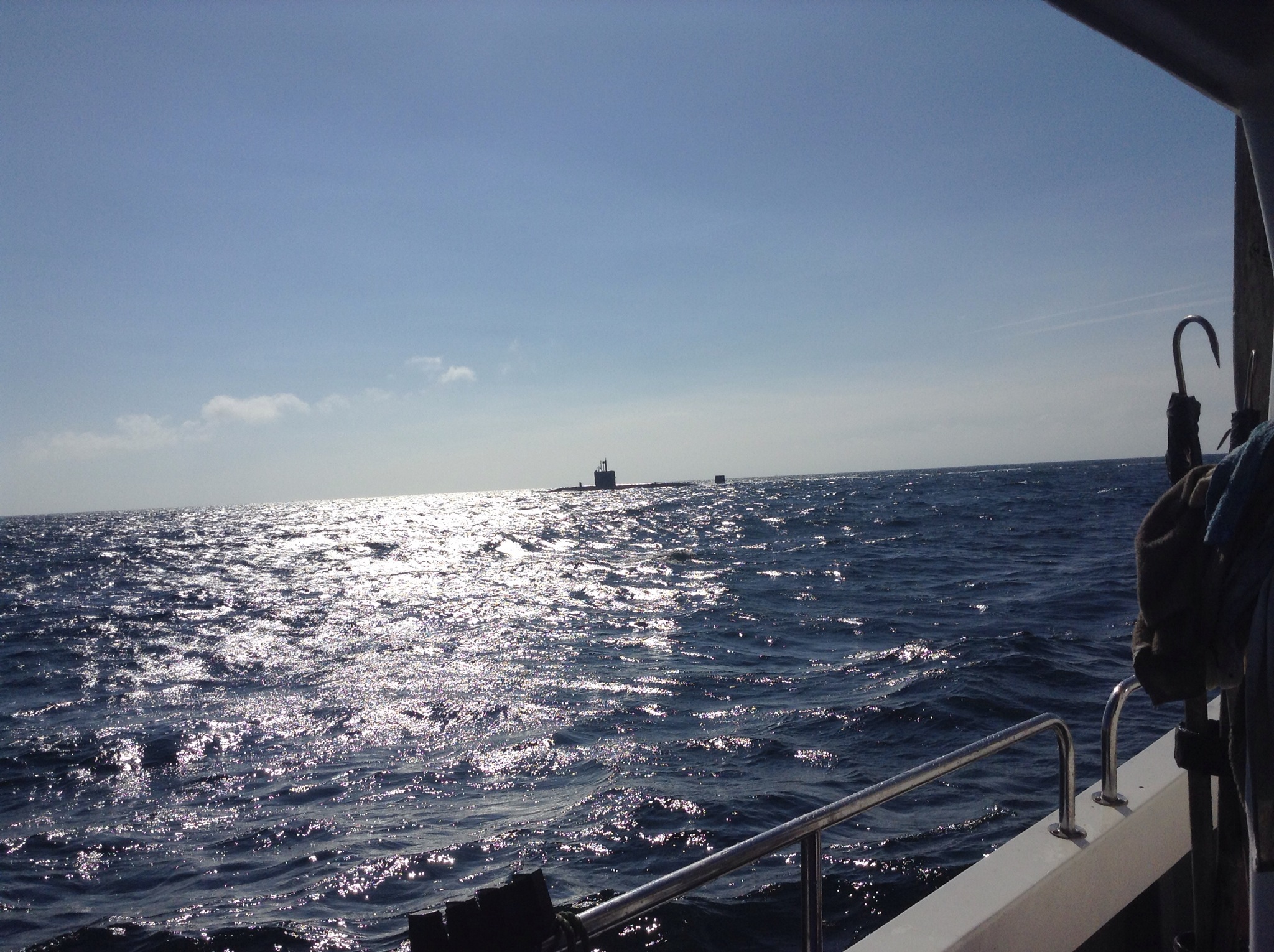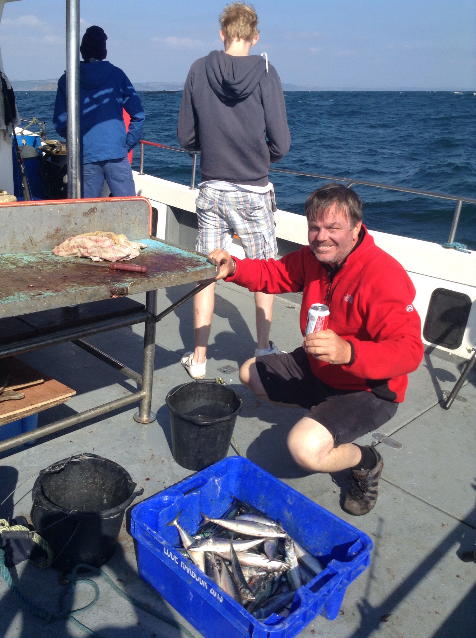 A sunny day yesterday and an early start for our Day Off – driving up to Looe for the fishing trip. Beautiful day but windy and there was a strong swell. Andrew and myself are lucky that we don’t get seasick easily but there were some queasy looking people about. The skipper is the best – Steve Brenchley – so we were confident. On the way out we were sailing alongside an old navy submarine which trawled up and down all day.