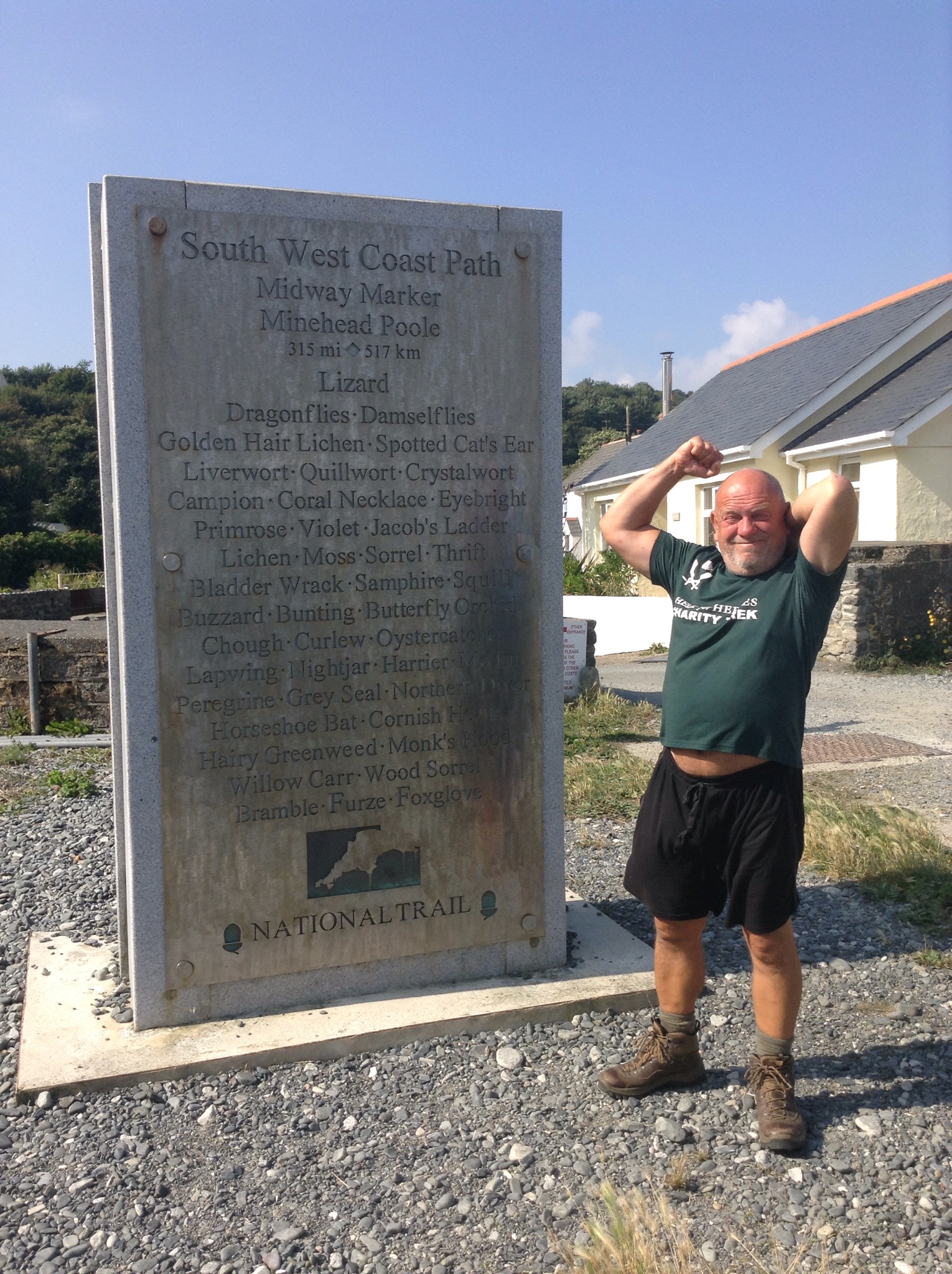 Coverack to Helford wasn’t a bad walk at all. Not too much hill and dale and surfaces comfortable for walking. Half way through the day we reached Halfway through the coastal path. 315 miles done, 315 to go and 65,000 feet climbed. So you start from Meadowhall in Sheffield and walk to Hyde Park in London, imagine that you climb Ben Nevis at Nottingham and Mount Everest at Leicester on the way and then you walk back, climbing Everest and Ben Nevis again and stop at Meadowhall. That’s the distance and the number of feet ascending I’ve done so far.