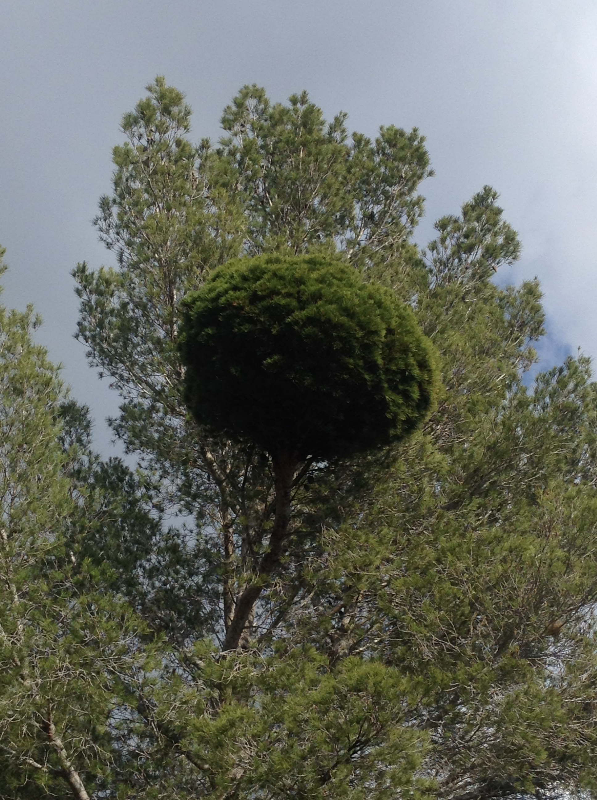 Coming down the stripes disappeared and I went astray, coming down to a 30 foot drop, which I managed to get down by clinging on to a tree growing next to it, and then boot-skiing down a long scree slope. At the col I turned right, instead of going back the way I had come, going 360 degrees round the mountain back to Moli. The views below the cloud line were great and I came upon this pine tree, being the only one I’ve ever seen with an Afro.