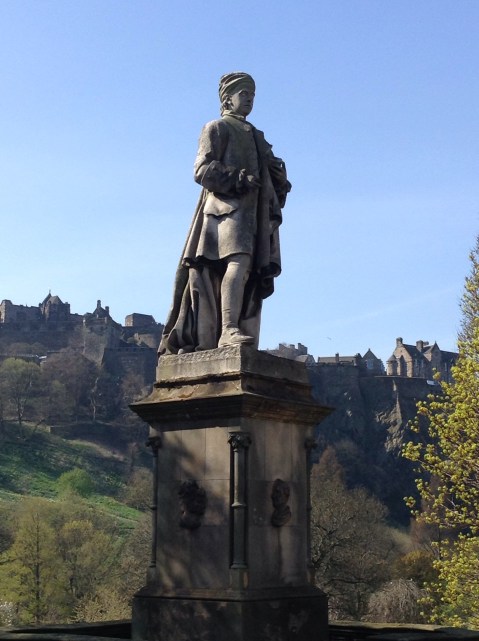 The castle still broods in the sun behind this statue of the painter Allan Ramsay.