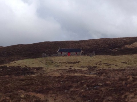 Going down the valley took me hours and hours, eating only a tin of tuna since breakfast and not taking a break. After 10 hours and 19 miles of walking I finally arrived at Oykell Bridge at 7.30 at night and there was a choice. There in the middle of nowhere was a posh hunting, shooting and salmon fishing hotel. I could stay here or cross the river and climb up four further miles to a freezing and lonely bothy in the dark. For some reason I can’t explain (but probably financial) I turned left and aimed for the Old Schoolhouse bothy. I was exhausted at that time and forced myself along the uphill track until it was right dark. I couldn’t do any more. I got my map, torch and GPS out and referenced my position on the map. I shouted out loud, I’m there I’m there. I was only half a mile away and I pulled my body along. To get there when it’s tough I count my steps and somehow it gives me strength. I gave it 1700 steps to get there, my legs are shorter than yours. At long last it emerged from the dark and I eased the door open whispering, Sorry to arrive so late and disturb you. There was no-one there. I fell into the place, put my sleeping bag on the wooden bench and got all my clothes on and my soaking wet boots and socks off. The Old Schoolhouse is thin walled and cold.