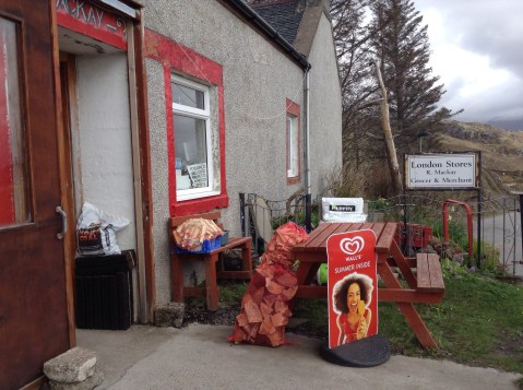 I got up late in Strathan bothy and set off to get over the hills to London Stores, a famous shop on this Trail. My boots and socks were covered in boggy water within two minutes. It was only three inches on the map but it took me until two thirty to get over to London Stores.