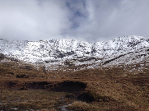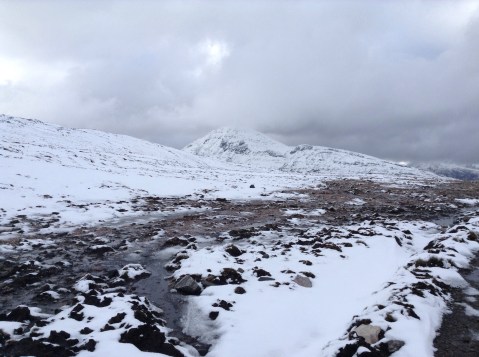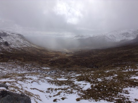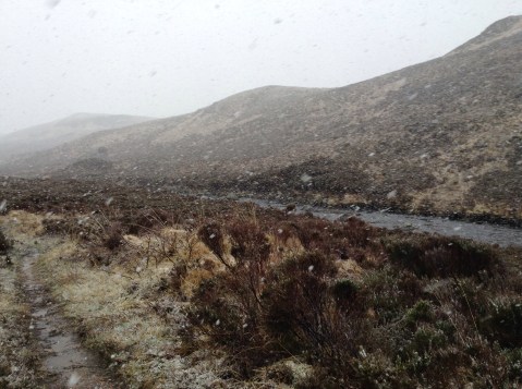 It had been snowing in Inchnadamph when I woke up, having spent a relatively sleepless night wrestling with whether I should get on the bus at 08.00 on the way home or not. I’d set the alarm to get the bus but when my feet touched the floor the grinding pain on the blisters and sores had reduced a lot. A second factor in deciding to give it another try was a message from Chris Morrish, a Gashead mate who has been right supportive through the South West trek and on this one. I’m carrying on as long as I physically can.
