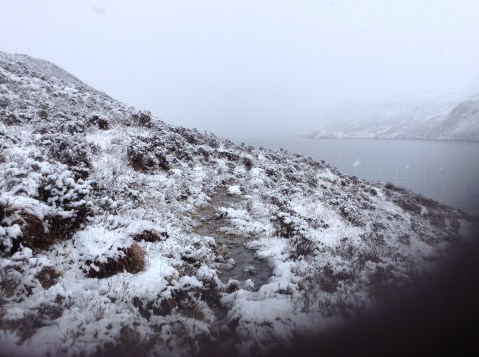 There was a bit of a path but it was waterlogged and my boots and socks were soaked within two minutes. Deja vu. It was going alright until it started to snow, and at first I thought that it couldn’t possibly settle.
