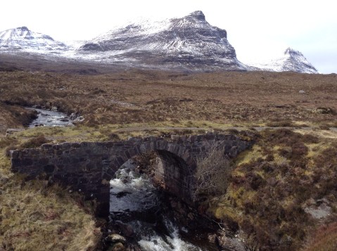 I set off towards Oykell Bridge with a view to ending up 23 miles away at a bothy in the hills beyond the bridge. (By the way bothies are old cottages or sheds in wilderness areas which are maintained by volunteers and which provide free shelter for walkers). It meant climbing up to a pass to the west and round the brooding hulk of Conival, a shoulder to shoulder mountain twin of Ben More Assynt, which is better known but a mere 33 feet higher than Conival. I chose the wrong side of the river to go uphill on and missed the track from the first step. It was rough ground when I’d hoped to make some quick progress. It took me an hour to find a river crossing point and it was snowing now again.