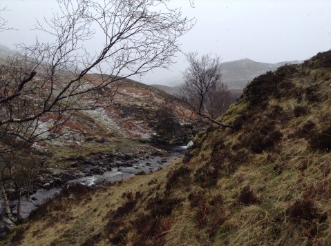 Within half an hour the glen was covered in it. Us in Scotland call a valley a glen. The temperature dropped below freezing. My trousers were soaked as much as my feet and I came to my first river without a bridge. I waded it. It didn’t make me any wetter.