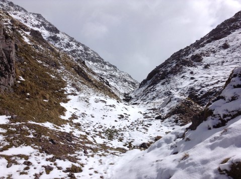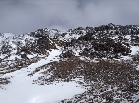 Finally I got over the other side, when the river became smaller and crossable. It had cost me an hour and valuable energy too. I climbed up the track directly towards snow-covered Conival.