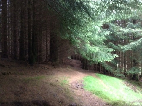 It was a difficult walk to the ruins, across a waterlogged plain with very deep peat bog ‘holes’ where the unwary would disappear up to their thighs. After that it was less boggy but straddling a steep mountainside for a couple of miles. I found a decent crossing of the river, it didn’t matter too much as my shoes were sodden, and went downstream reasonably quickly into a pine forest with a decent woodland path through it. All the time a mechanical banging was growing louder.