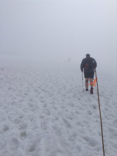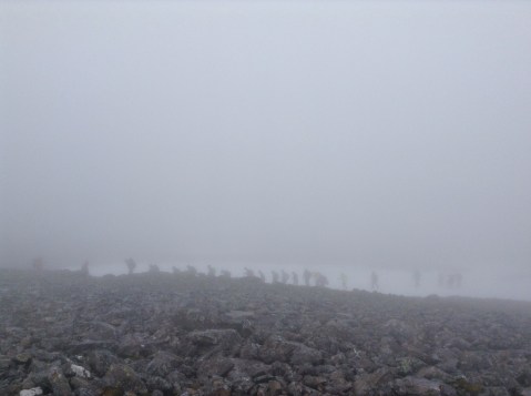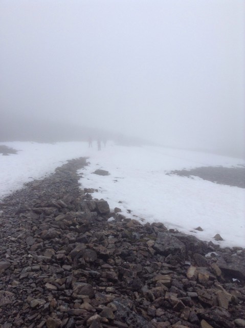 The path up is hard and steep, and being almost the longest day in the year and a Saturday the mountain was crawling with charity walkers, several hundred of them; and there’s only one safe path. After 3 hours of slog I reached the snow line and it had turned windy and very cold.