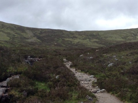 I woke up earlyish in the tent and tried to pack as much as I could in the inner tent, which keeps out the midges. I had a sandwich left which I’d bought in Inverness and a Bounty bar so breakfast was provided for and I’d surely come across a shop at some time before Fort William. Sadly my water bottle top wasn’t fixed tightly enough and most of it had leaked in the bottom of my rucksack. I took a couple of mouthfuls, packed the tent and set off up the footpath into the mountains at 8.15. Not a bad start. It was raining and my boots were still wet inside from the previous day but my feet and legs were in reasonable shape.