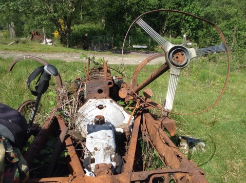 The Way crosses the road and up the hill, where I found a ruined car with a seat to mapread in for a few minutes.