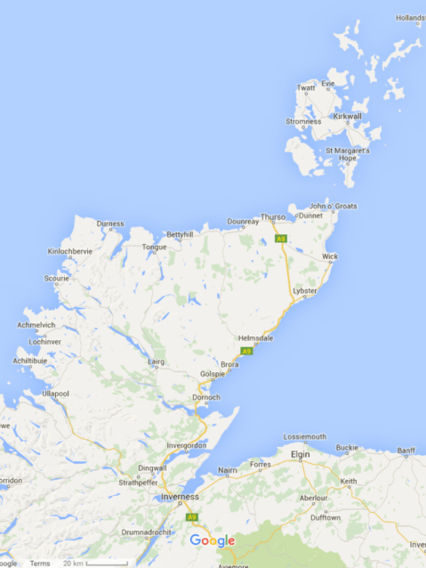 Well there isn’t. It’s being negotiated by people who want to secure rights of way for walkers like me so they can benefit the area by increasing tourism. It will be a route from John O’Groats to Cape Wrath which will run close to the remote northernmost coast of the British Mainland. On the map below you can see John O’Groats on the mainland top right and Cape Wrath is the furthest point northwest beyond Durness. There is a road most of the way but I won’t take it for too long.