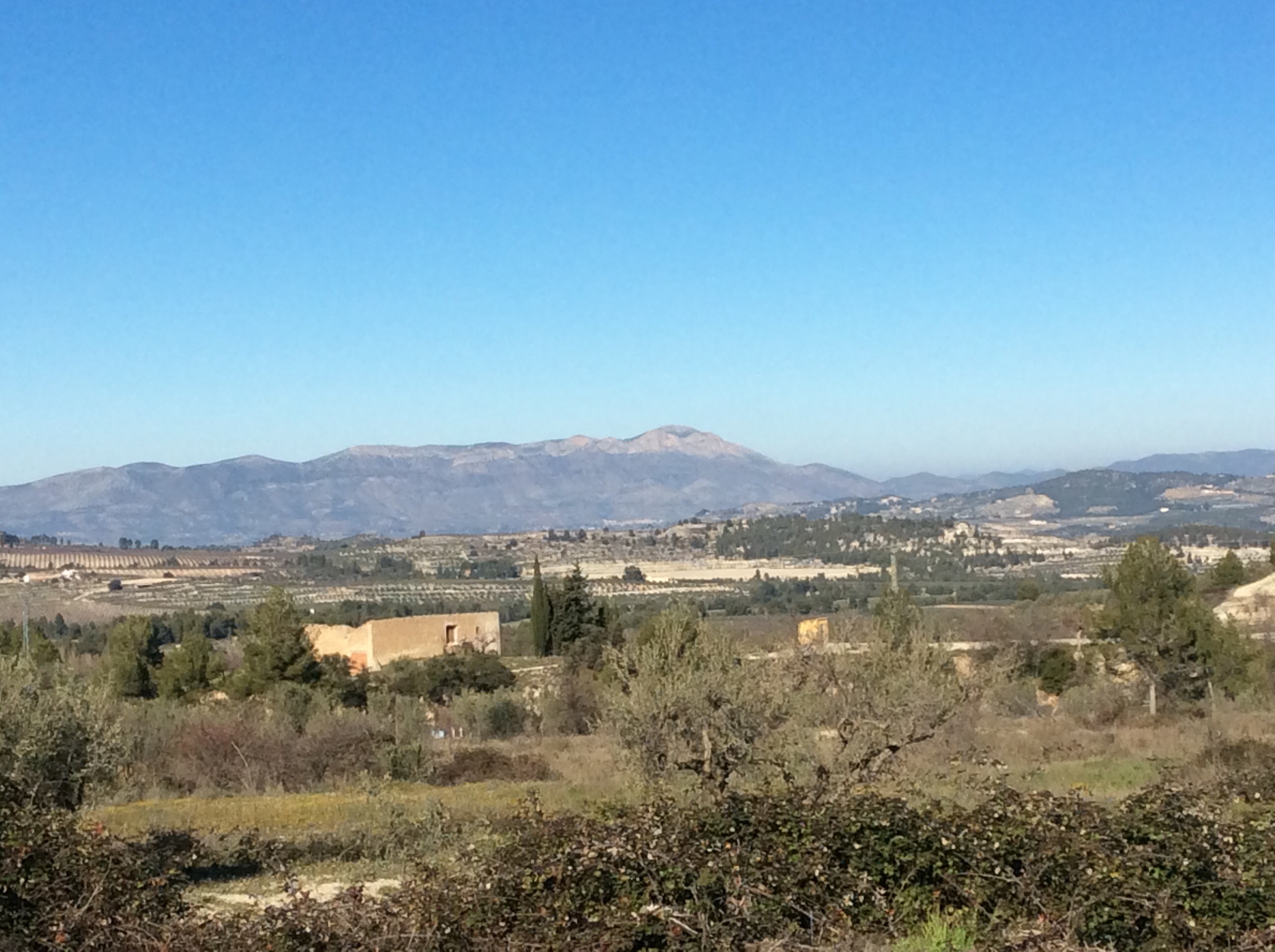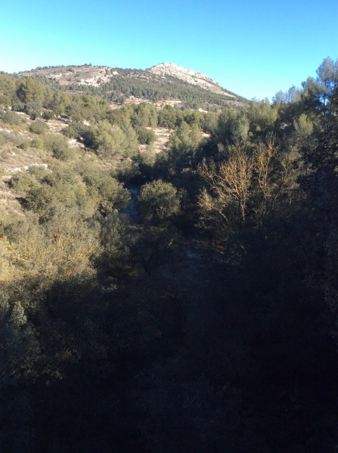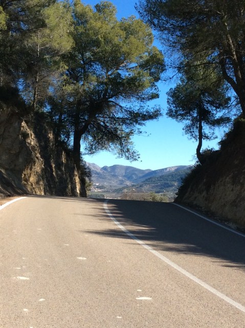 The road, as usual, works its way up a hill and down to Benifallim, but not such a high one or steep one. The views are more pastoral than dramatic, but still lovely. In this one you can see the frost on the valley floor under the trees. It’s going to be cold nights for camping. Oh heck. But Scotland was freezing and I got rained and snowed off the Cape Wrath trail. And then I only had my trusty tarp Wilson. This time I’ve got my one man tent and an inflatable mattress to keep me off the cold earth. In Jockland I didn’t have owt but a groundsheet. Be reight.