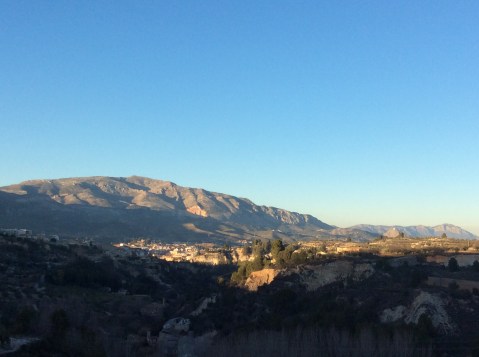 On my way back I made a stop at the Venta Sant Jordi, the inn on the photo with the bikes. It was half three but they were still serving late lunch and I had a nice menu of the day with warming local scran. Cheeses, cured ham, pork ribs, hot onion croquettes. Just what the doctor ordered. Well actually it was me that ordered it. The sun was going down when I came out so I legged it back to the hostel before the ice took over. I was only in my shorts and t shirt. Alcoy in the valley bottom backed by the hills I’m going over tomorrow, resplendent in the pale, chilly evening sun. Great. A hot bath. I washed my dirty clothes and hung them over my radiators, which then went off. Hope they come back on. Pretty please.