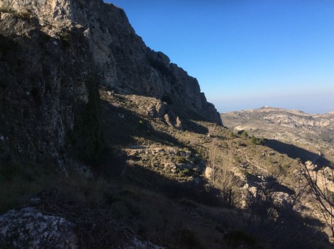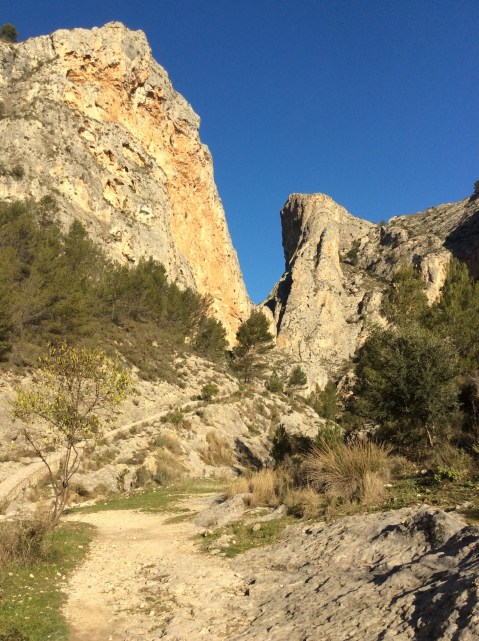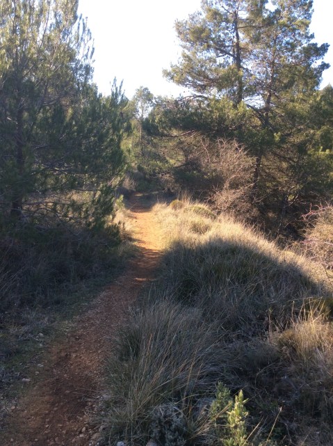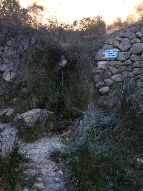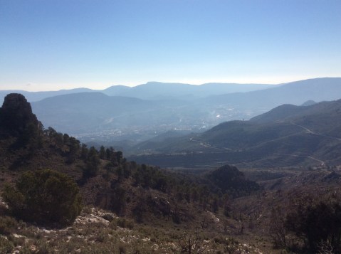 The route cuts round the top of the mountain, Serra Mariola, and heads west and undulatingly downhill. But it disappears and then miraculously reappears two hundred metres to the left or right and you end up pushing through gorse and other shrubs to get back to it. You only know it’s there because of a trusty GPS, that I’ve christened Gav. Without Gav I’d still be up there.