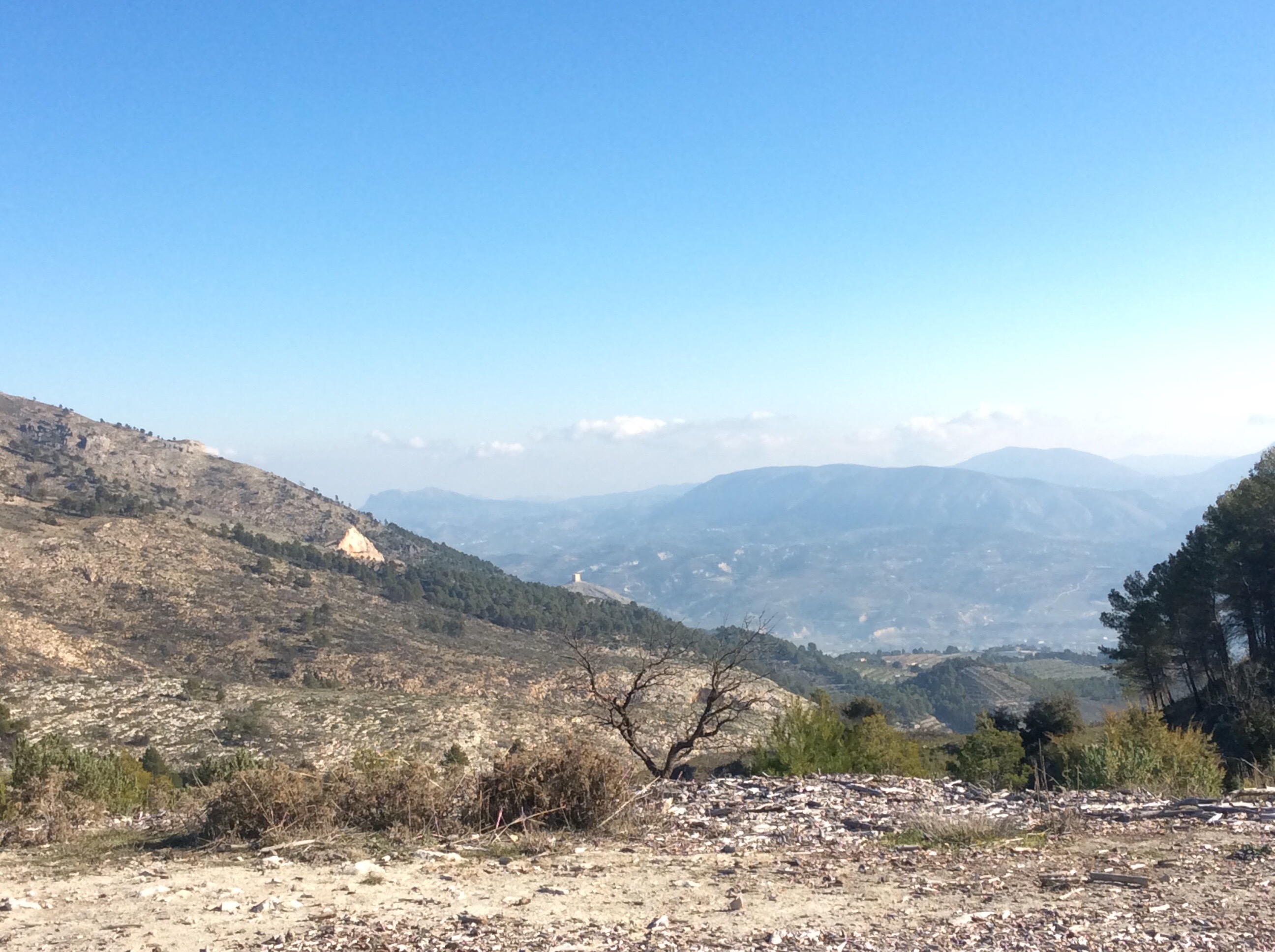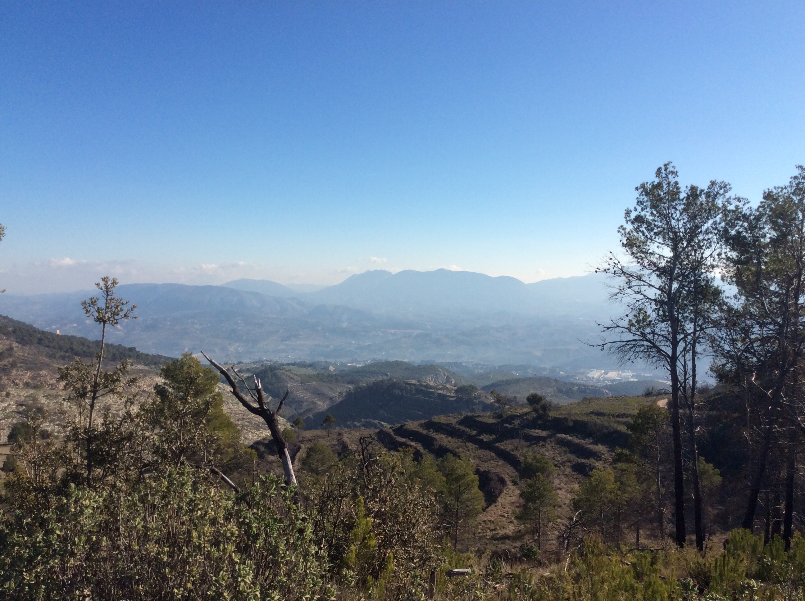 The route cuts round the top of the mountain, Serra Mariola, and heads west and undulatingly downhill. But it disappears and then miraculously reappears two hundred metres to the left or right and you end up pushing through gorse and other shrubs to get back to it. You only know it’s there because of a trusty GPS, that I’ve christened Gav. Without Gav I’d still be up there.