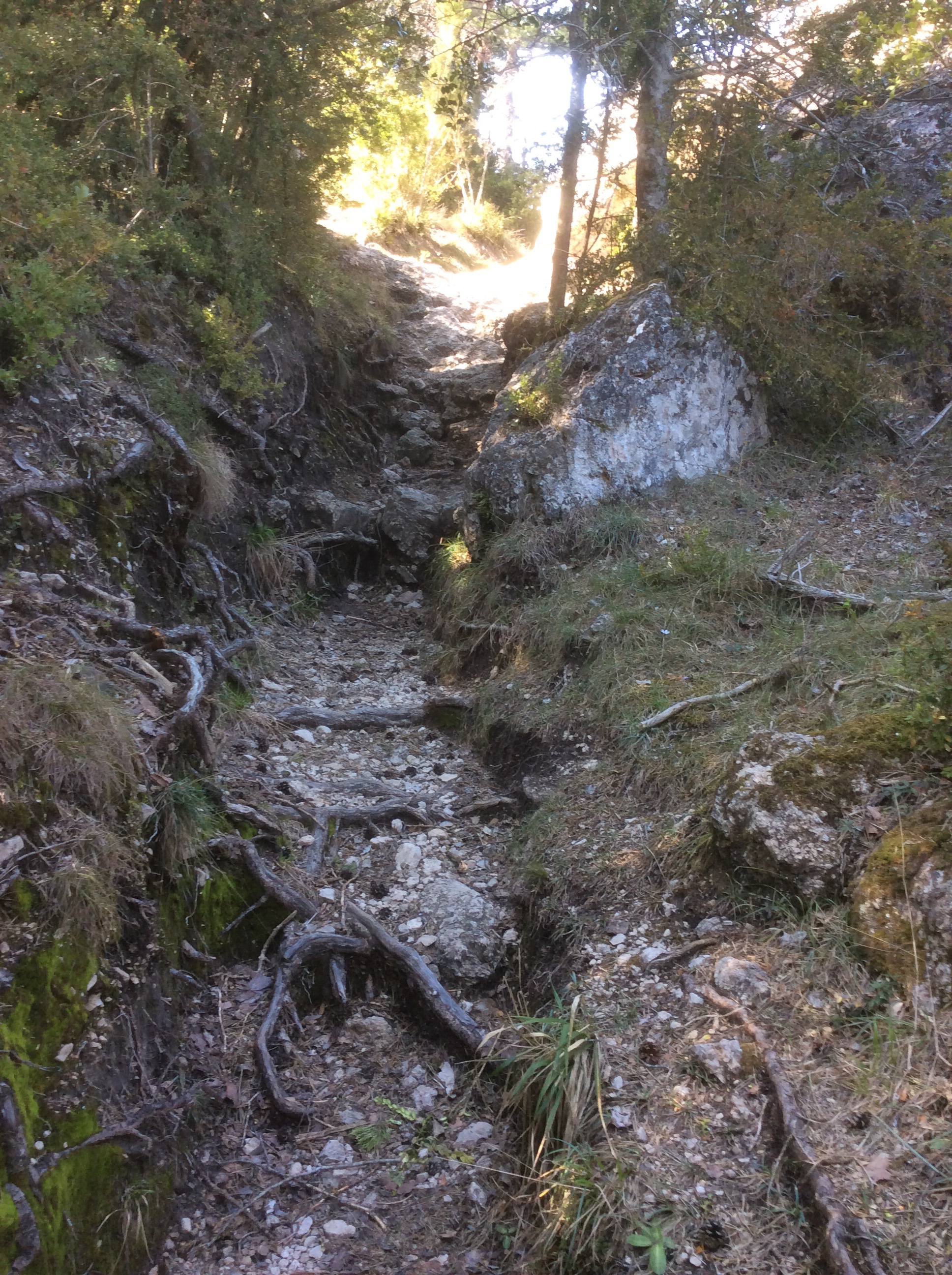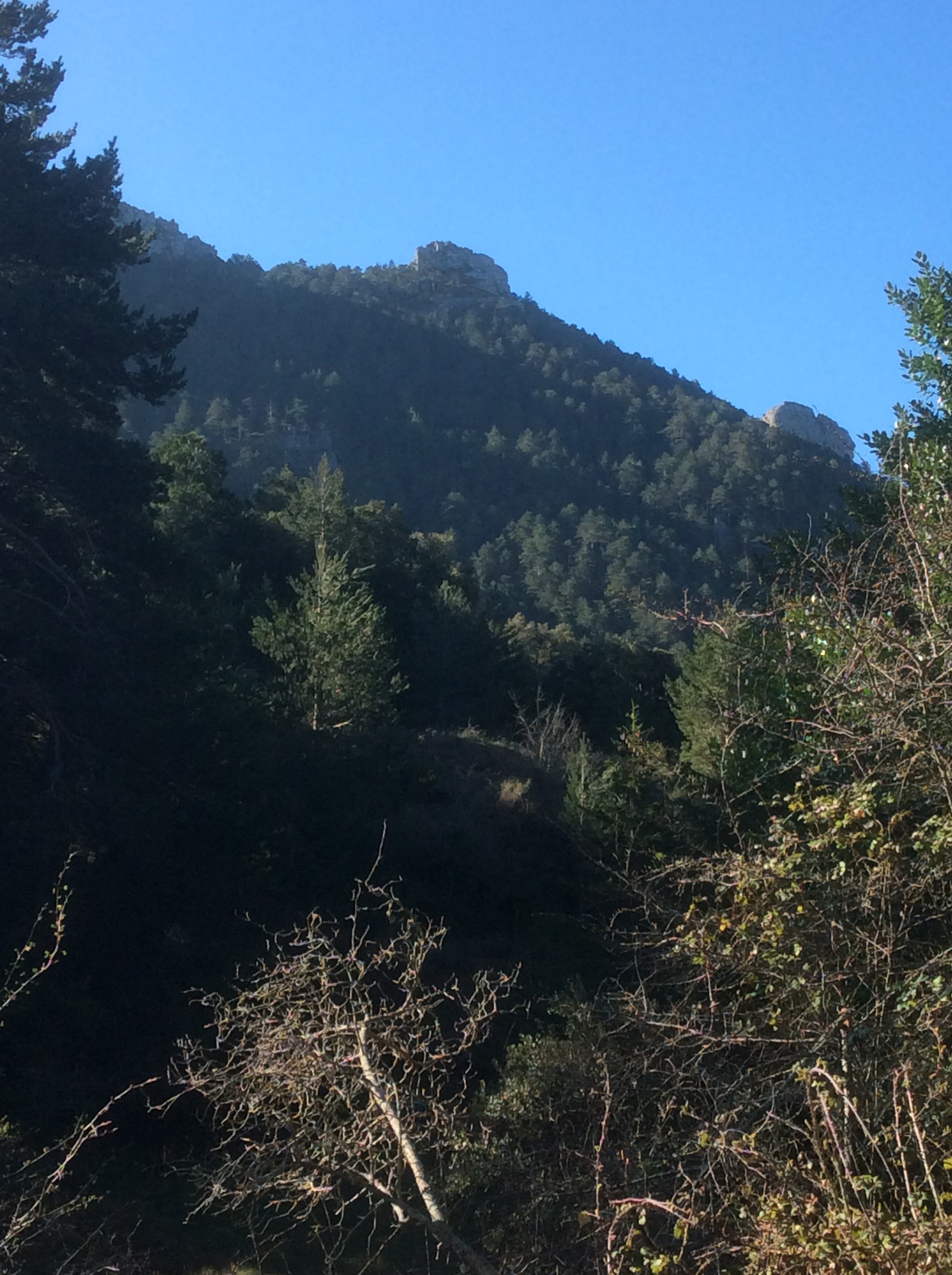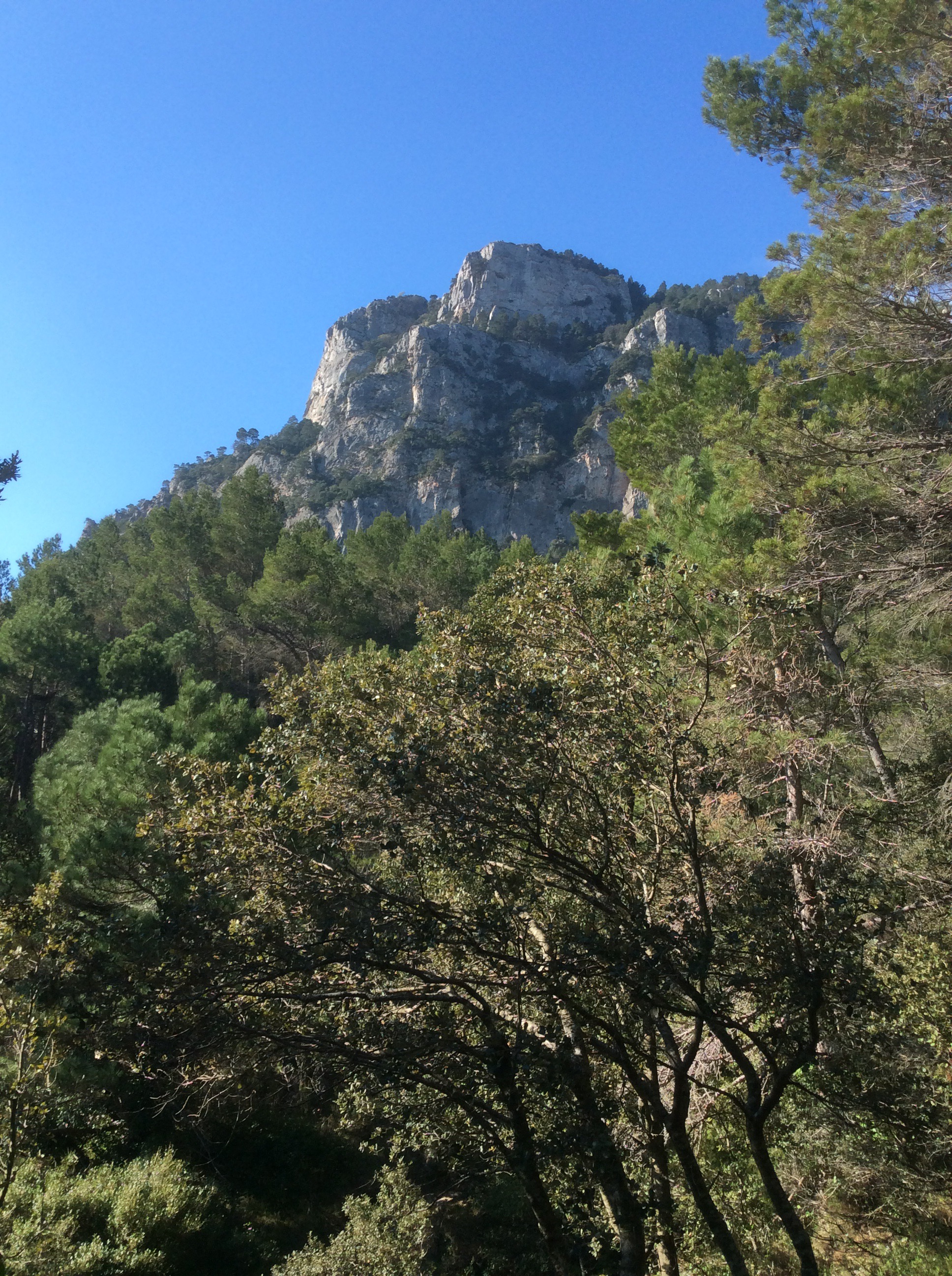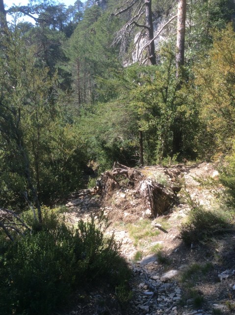 I struck south west and quickly climbed over a hill to lose sight of the village. The mountains became hills and the valleys were noticeably shallower and less steep. But stunning all the same. Just different. The path dropped down through shadowed forest. Great for keeping the rapidly increasing heat at bay. For the last couple of days you could have navigated by the red and white painted strips that crop up every couple of hundred yards, but not consistently. They mark out the GR7 but are noticeably absent when you need to make a choice of route at a junction. The GPS is most useful then.There’s a red and white marker on the rock to the right just before the woods, and they appear on trees and walls intermittently.