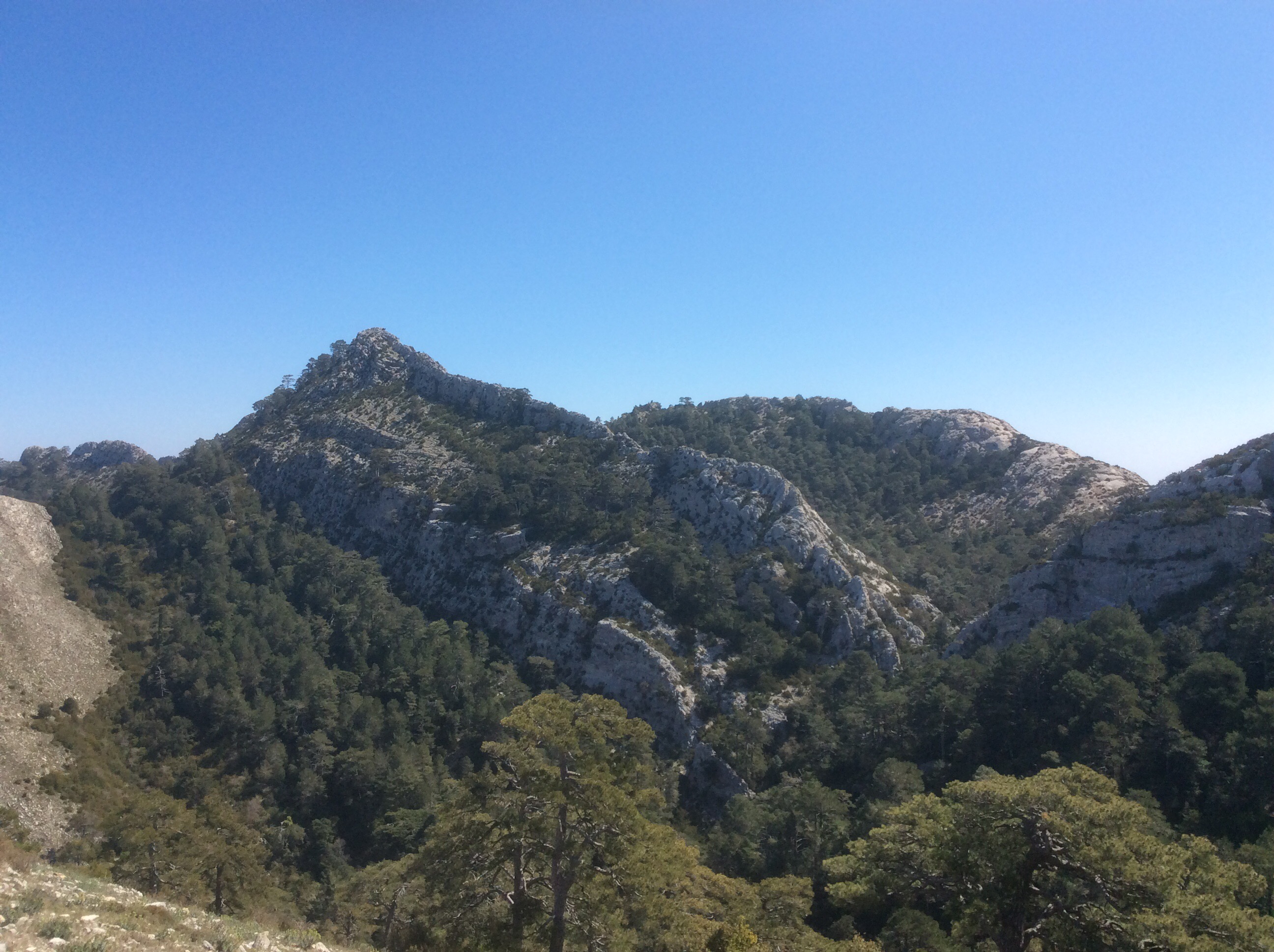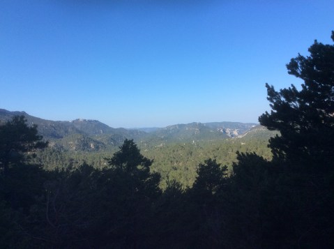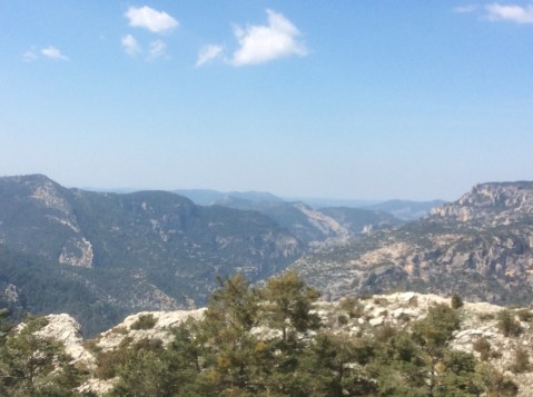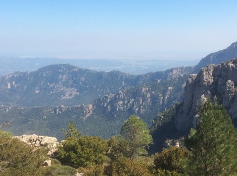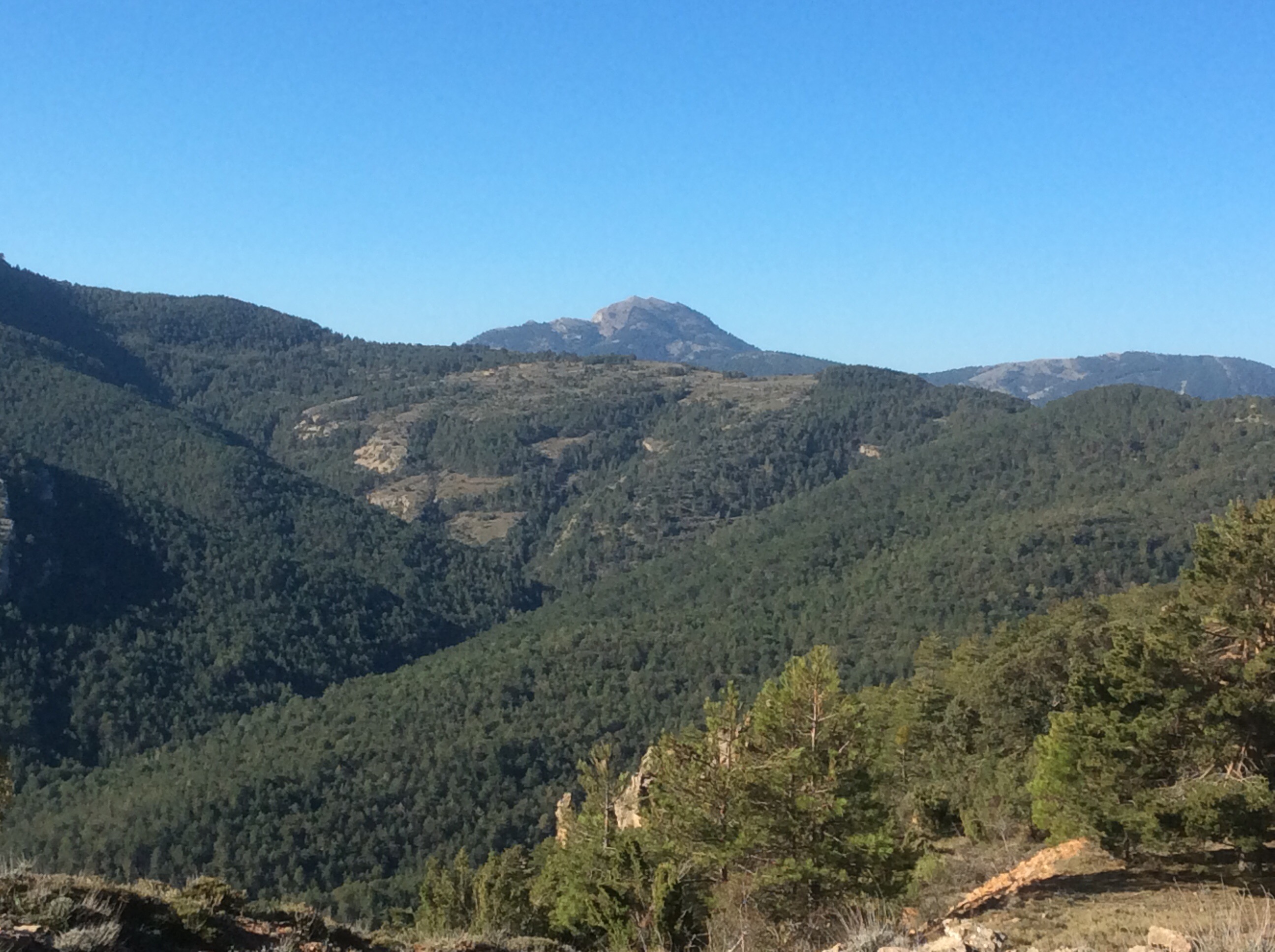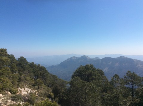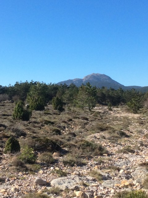 Rising up I was making good time despite the steepness of the slope, with hairpin bends helping level things a bit. The broader view back, including Penyagolosa, is………