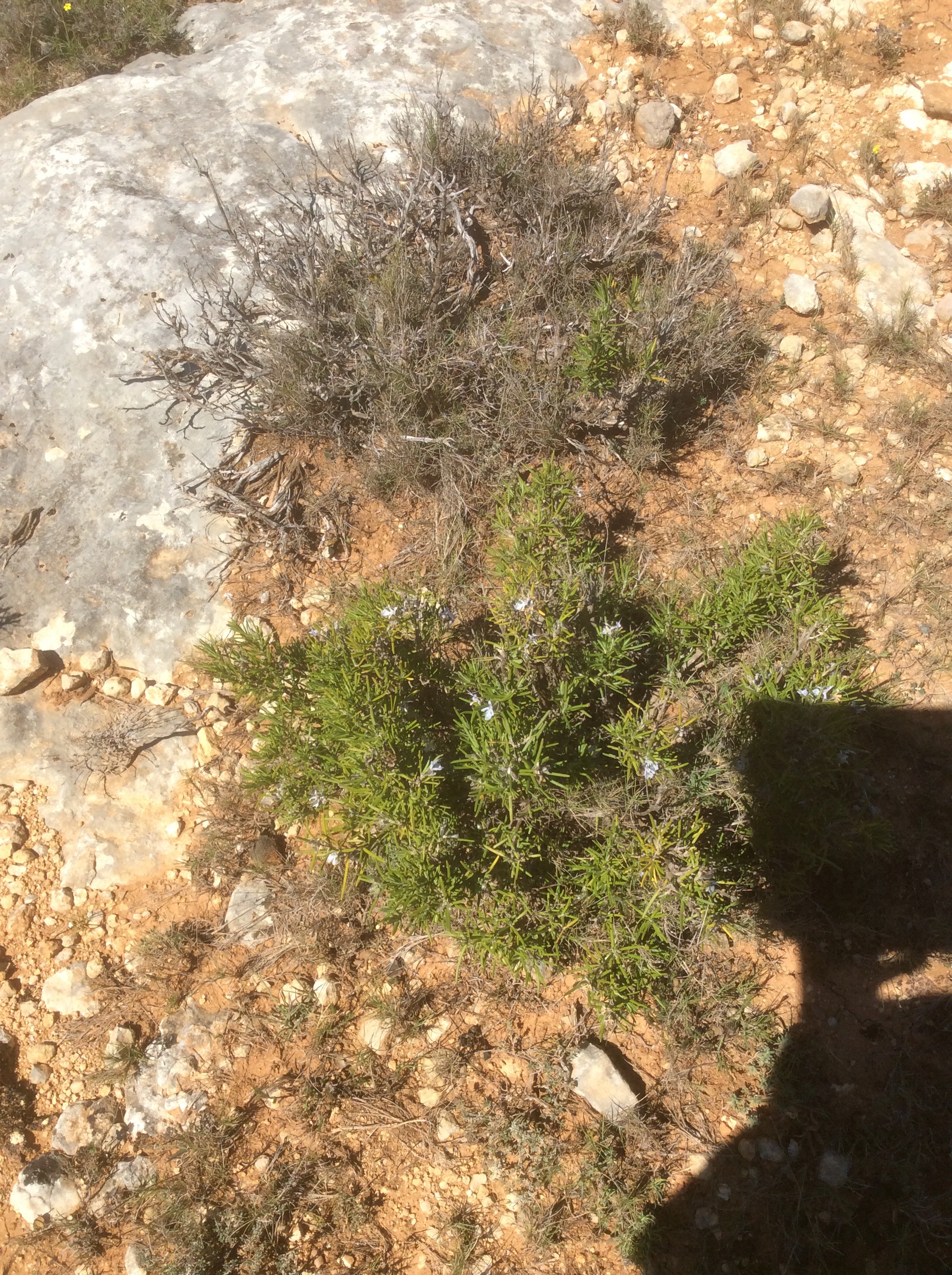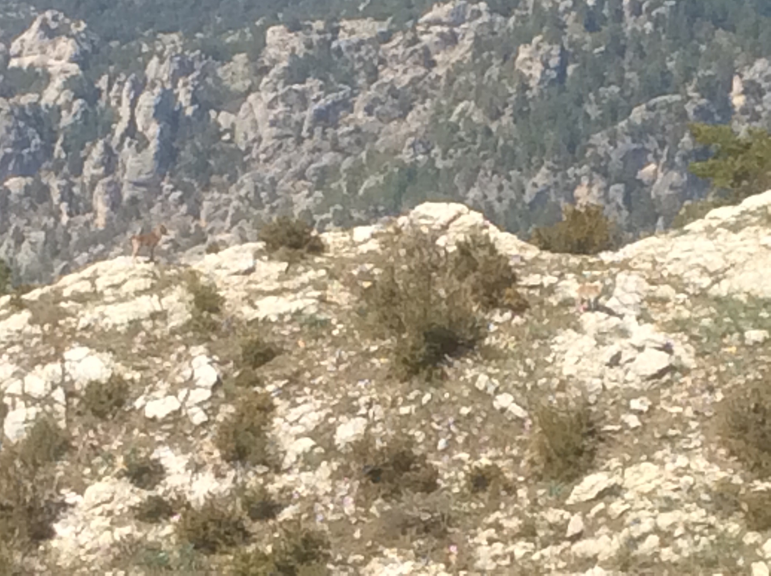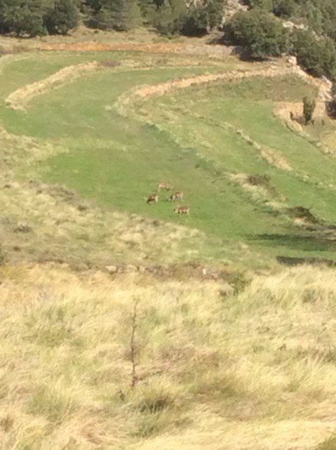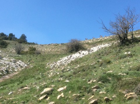 But dropping down meant climbing up again. As I reached the top of the next ridge I slumped down on a rock and drank a bottle of water which I’d earlier swallowed and then filled up at a rare spring. Limestone don’t lend itself to mountain streams. I heard the distinctive chirp of an ibex but had to put my iPad on maximum expand to catch the two of them in this photo, plus a baby behind a bush between the two.