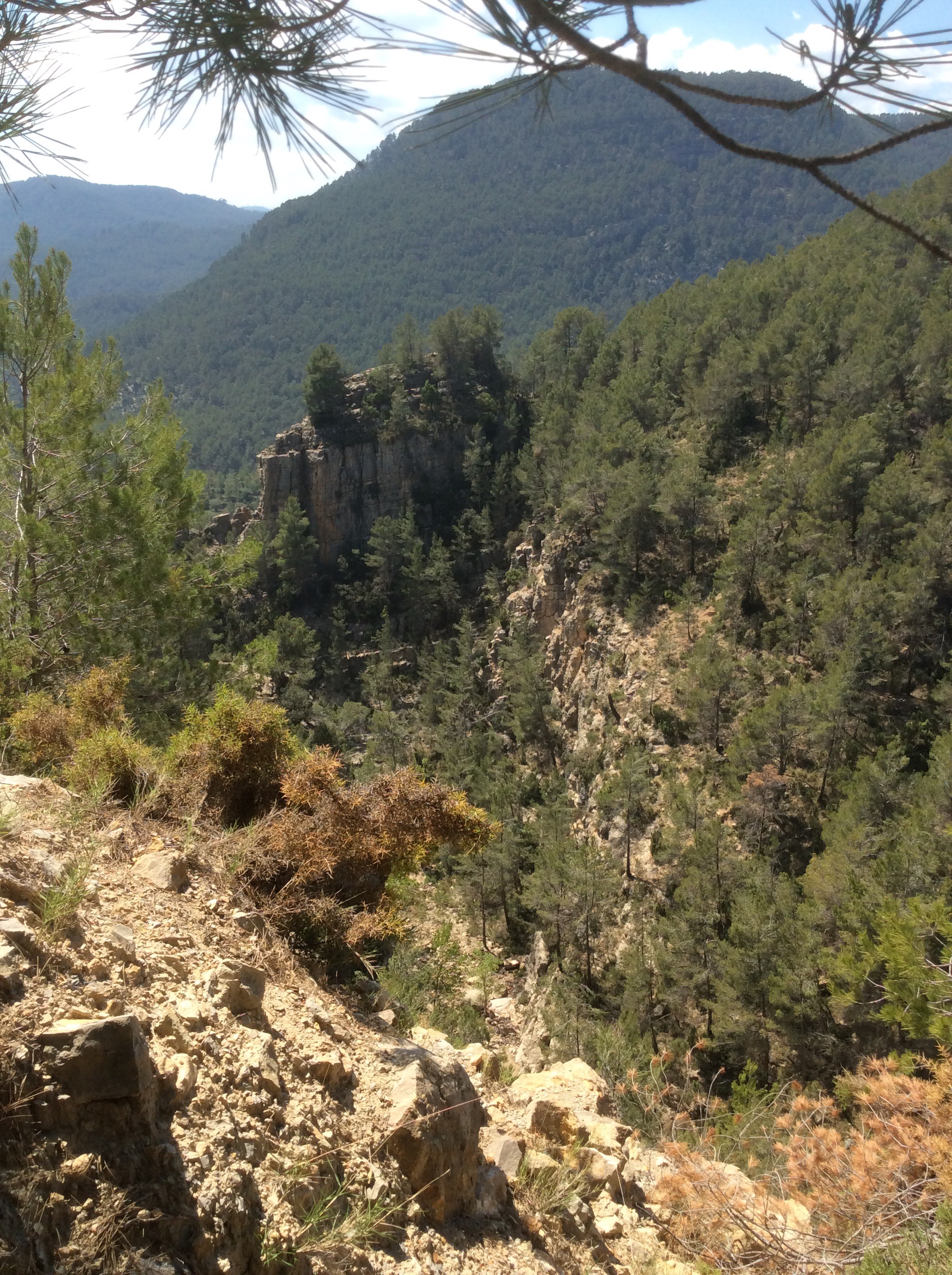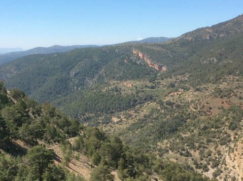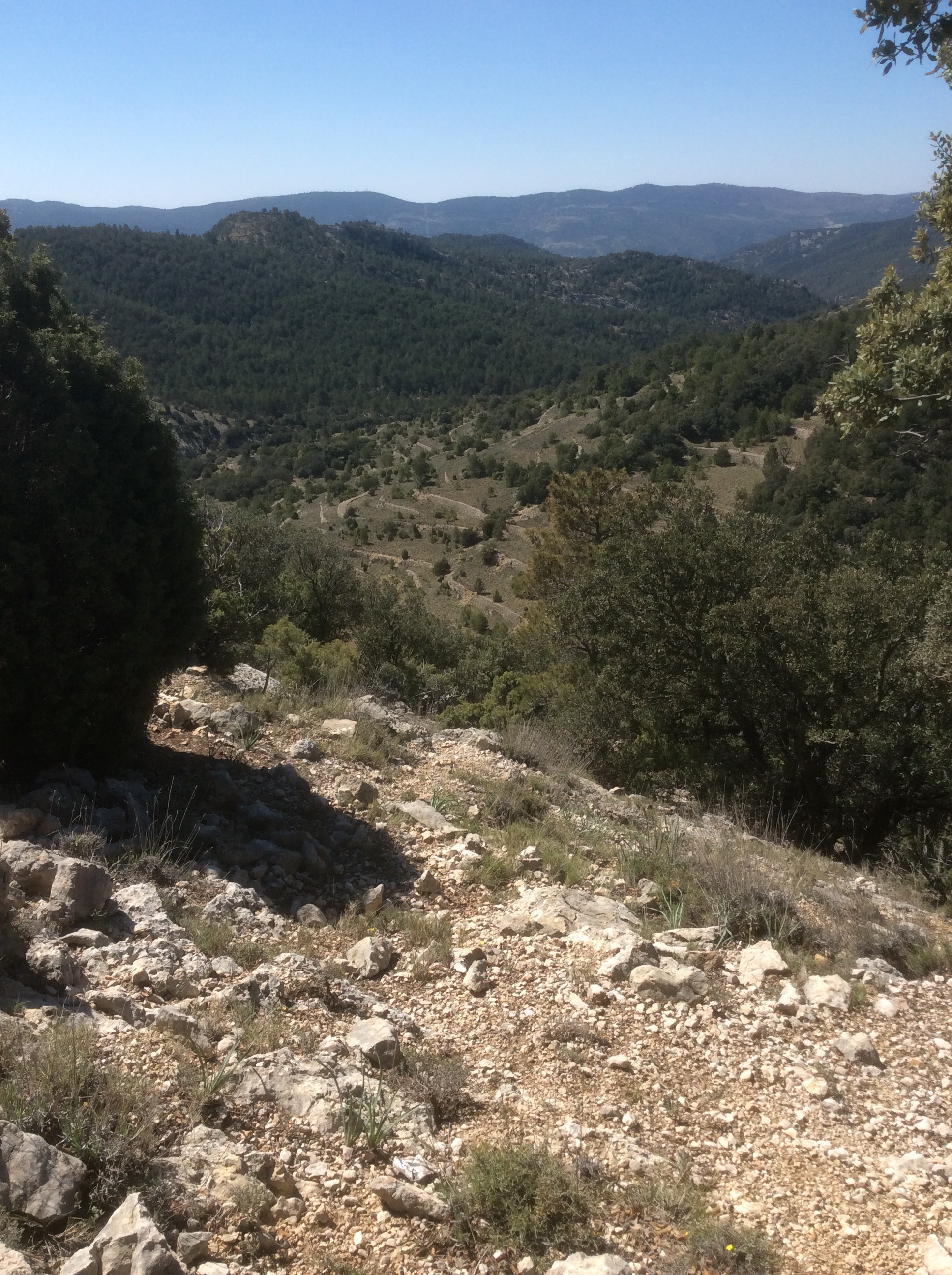 The track takes a detour round Penyagolosa to the west and then drops steeply and curves round eventually to Vilafermosa del Riu. There are two spellings for most places, Valencian dialect (like Catalan) and Castilian Spanish. Vilafermosa del Riu is Villahermosa del Rio, both meaning beautiful river town. I missed the turnoff where the path dropped and that cost me an extra mile down and back. Going down the right path the going was large pebble strewn but beautiful views.