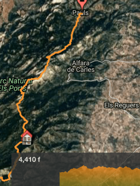 I was staying at the Alberg dels Ports in Pauls in a six bunk bed room on my own. Paid the dormitory rate unall but nobody else there. I set up a washing line across the room from a top bunk into the bathroom (I usually carry a fair length of parachute cord). Some of my gear was stinking so I washed it in the shower, hung it on my line. Dry by morning. Two cereal bars, lots of water and away at 8am. The walk today was marked as ‘severe’on a GR7 website. The overall climb was 5200 feet over only 14 miles so it was going to be tough. I was heading for a Refugio, like a Youth Hostel type thing, in Caro, a tiny hamlet high in the Dels Ports National Park. Me being young and that.