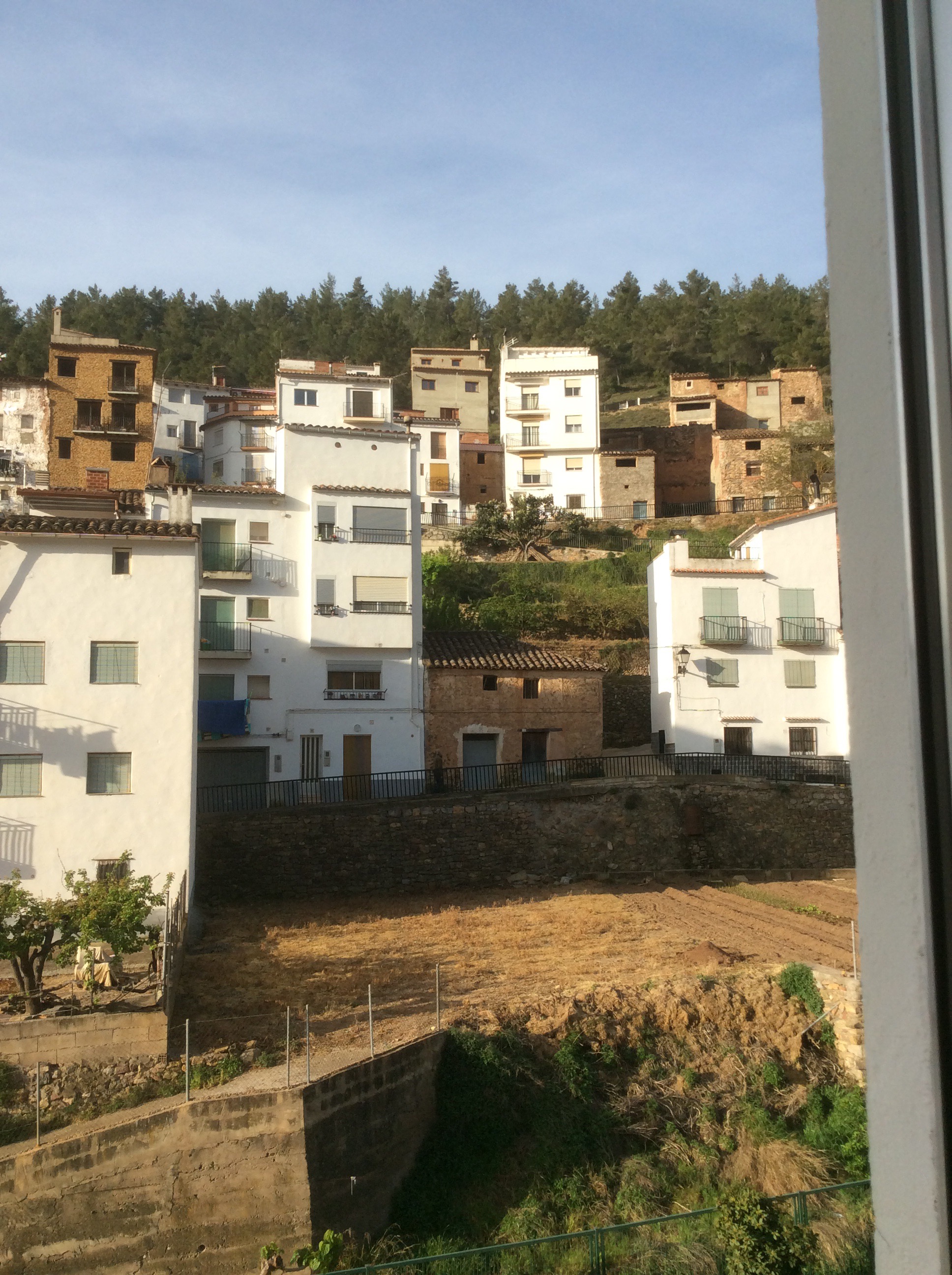 Montant to Xerica was calling. My bedroom window view showed a sunny but slightly cloudy day. 12 miles to do up the valley from Montant to a pass on the top and then an even length drop to Xerica.