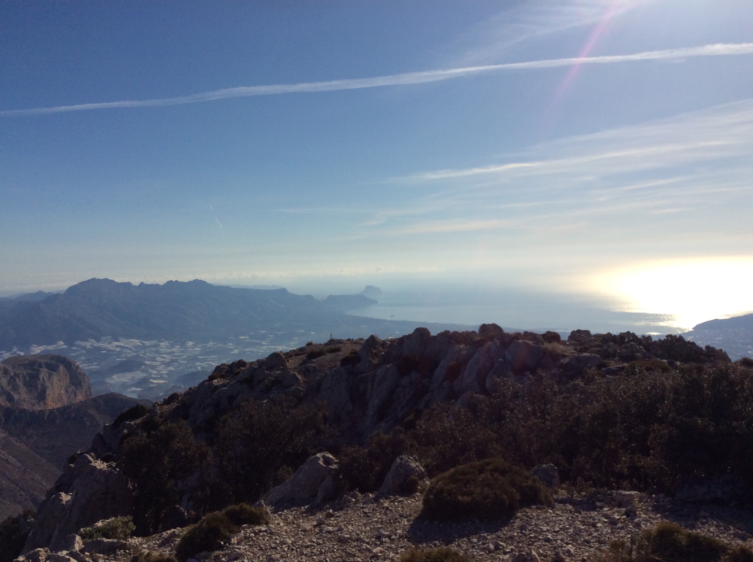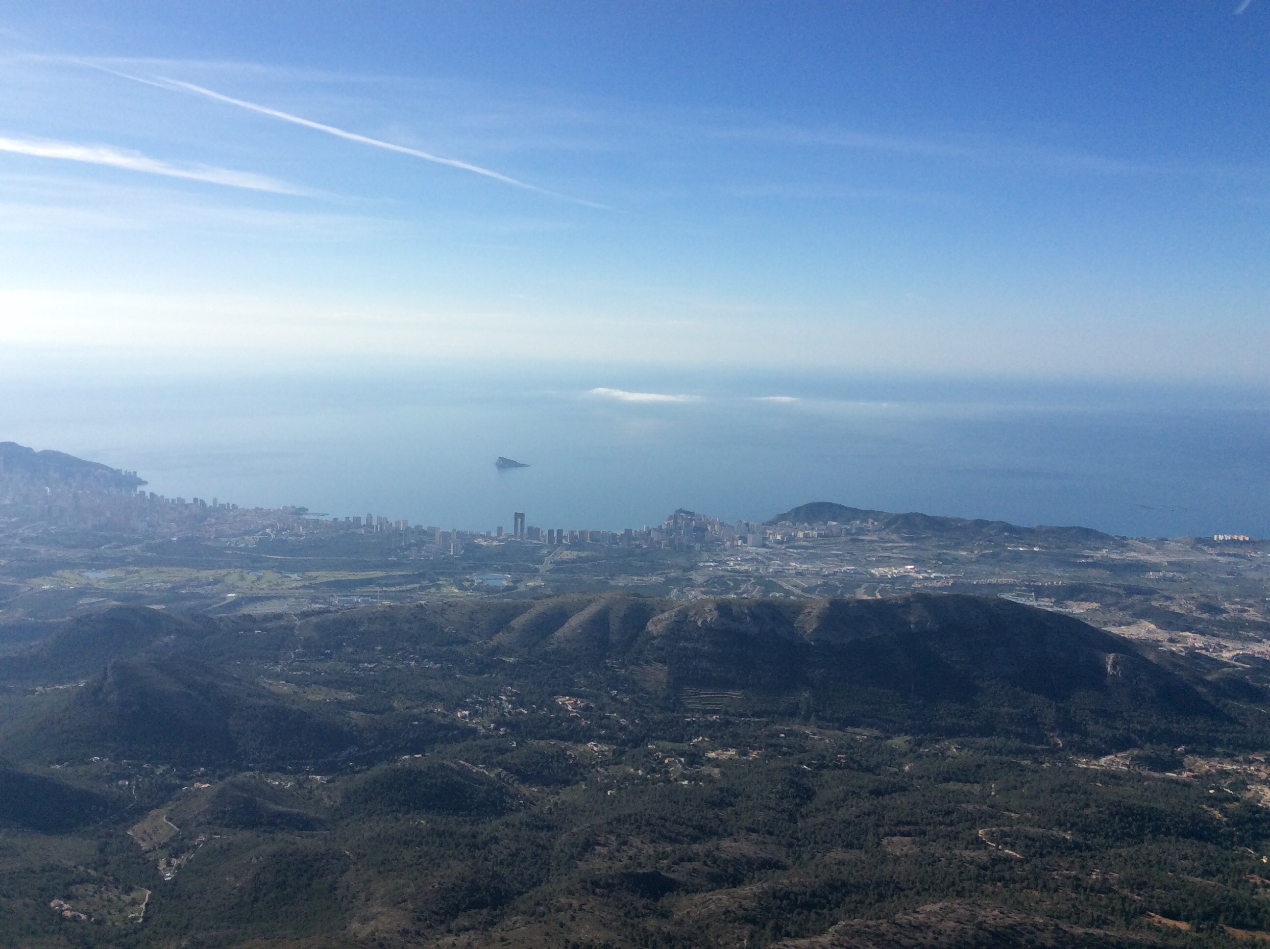 Right….. I’ve been doing a bit of training in Spain on holiday with Maggie, swimming and walking really. But two days I climbed/scrambled Puig Campana rising up behind Benidorm. Higher than Ben Nevis and with two main routes; landward and seaward. The landward, round the back, route is quite strenuous and the seaward route is called ‘the Vertical’ because it’s quite steep.