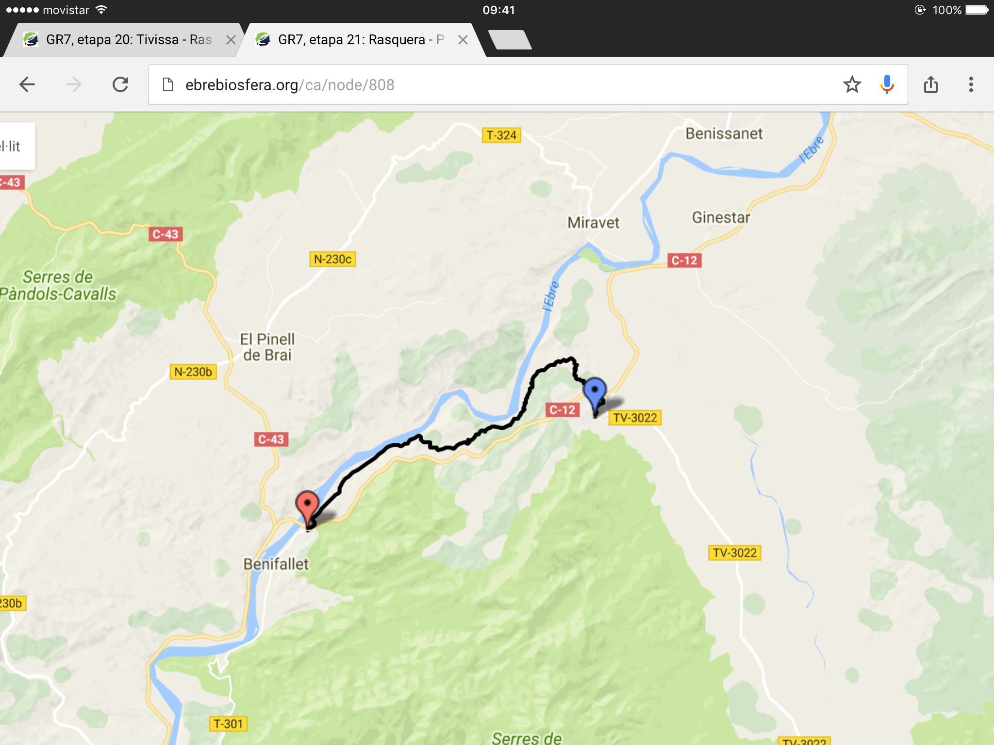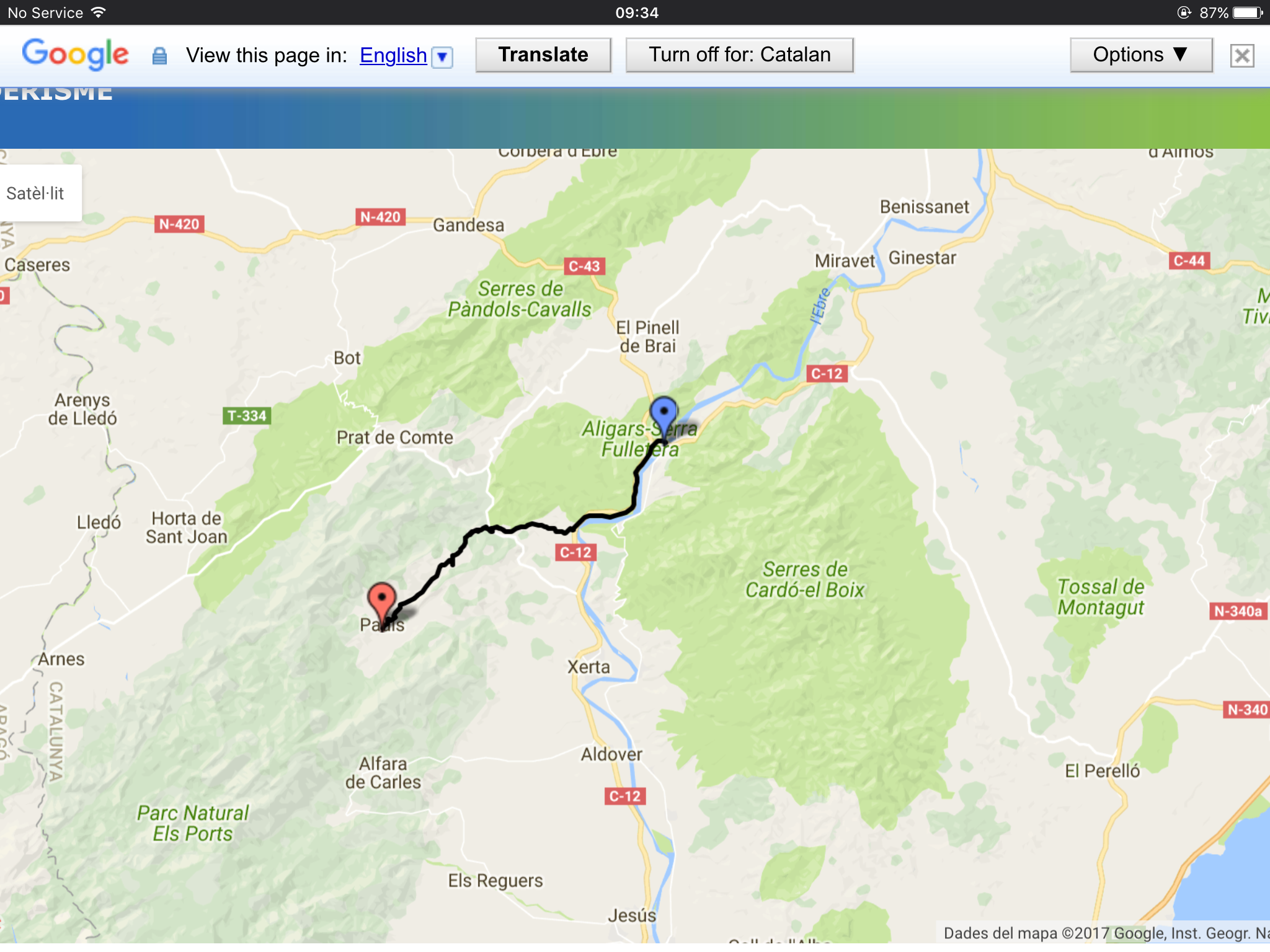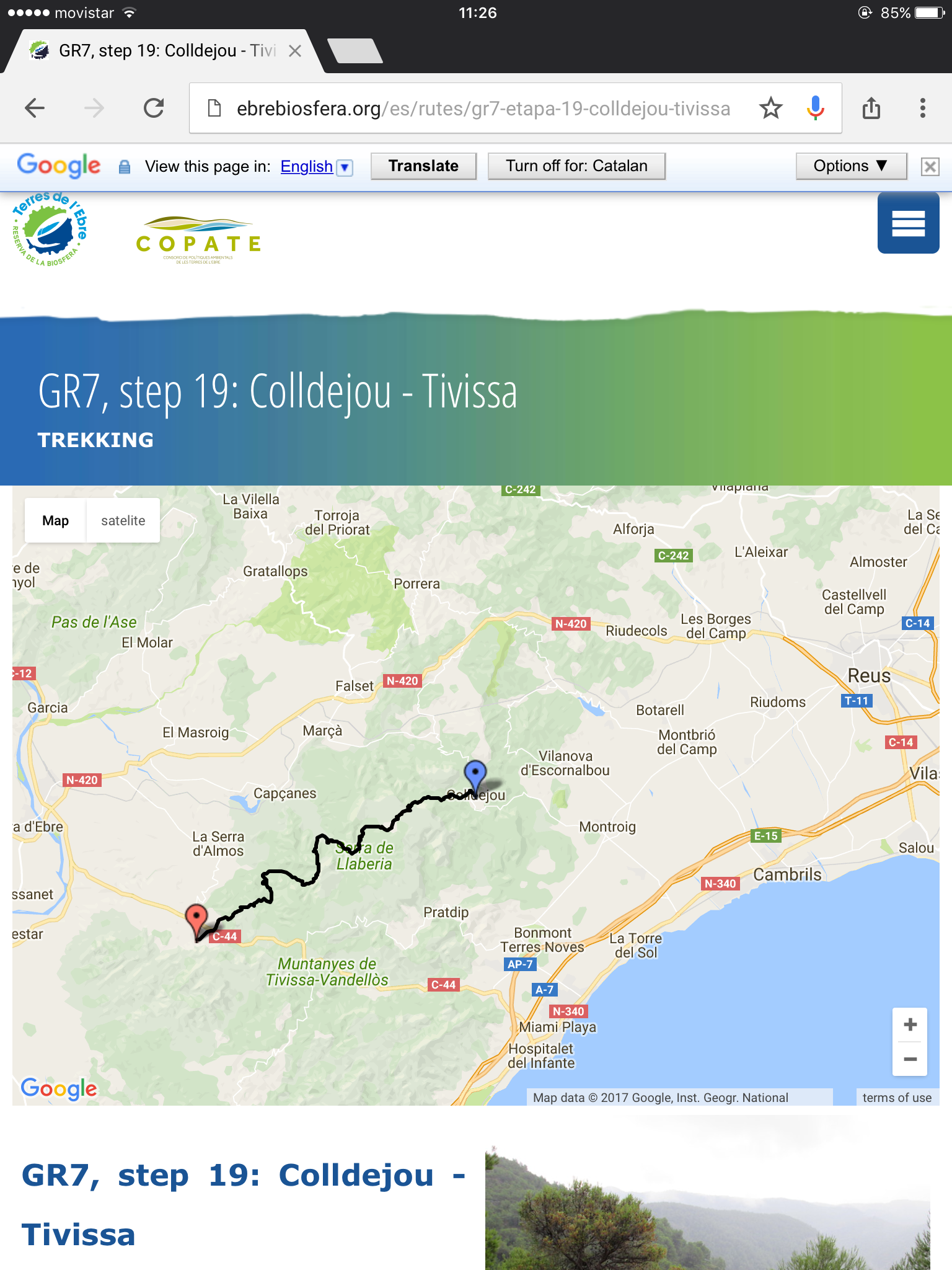 Tomorrow another road walk from Montroig to Colldejou, to meet up with the GR7 footpath. Then following it southwards over the mountains to a town called Tivissa. I was going to camp but the Hotel Braseria Tivissa reduced its room rate to £27 so that’ll do me. It’s a nice gaff by the looks of it and I’m walking over 20 miles and climbing over several mountain ridges so I’ll need it.