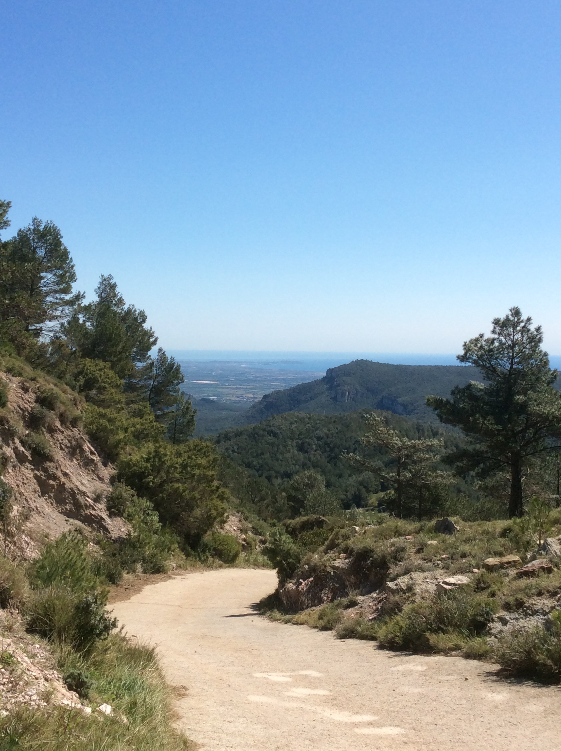 By noon I’d linked up with the GR7, and was feeling pretty fantastic. The footpath here was a wide country lane, with a view back down to the Mediterranean.