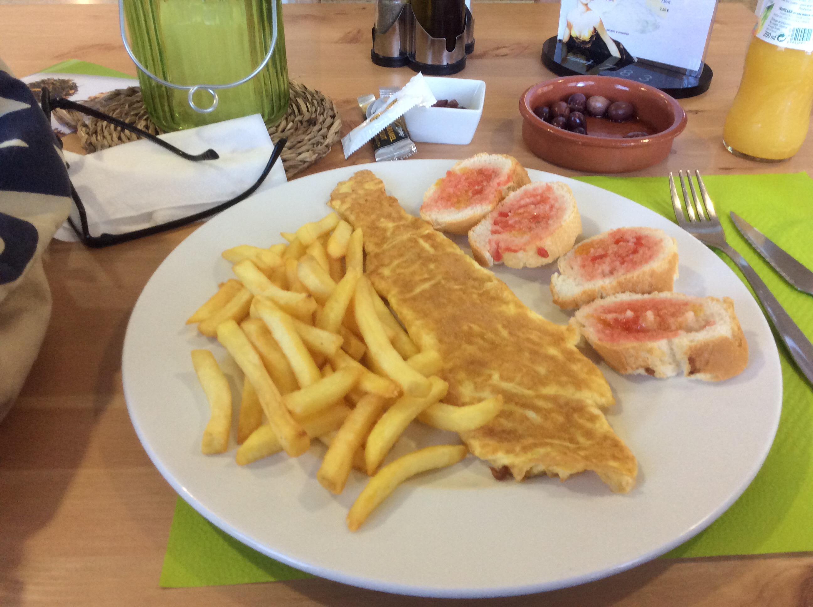 Breakfast at the Braseria Tivissa was really good. Tortilla, chips and bread (with olive oil and mashed tomatoes), olives, orange juice and coffee. Four quid. In fact the room, the beers, bottled water, great tapas for dinner and breakfast was £37. You wunt get the room for that in most of the UK.