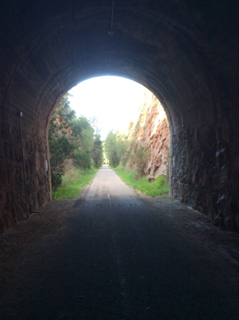 I was going to follow the old rail track from the station to meet up again with the GR7 by the river, turning west over some hills and ending in Pauls. A good, even walk to start the day, passing through three tunnels. Bye bye Estacion and hello tunnels.