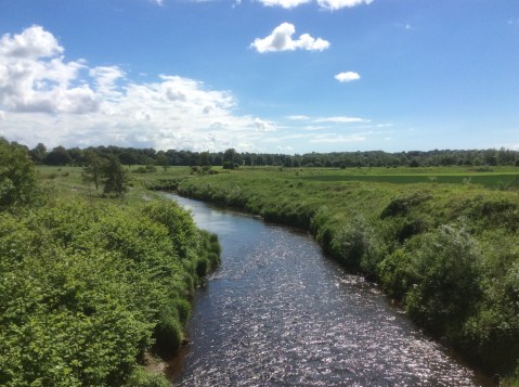 The sun was out as the early clouds scudded across the sky and all was well with the world. Walking was made for days like this. No, that ain’t right. Days like this were made for walking. And that’s just what I’ll do. The river was still in flood from yesterday’s rain.