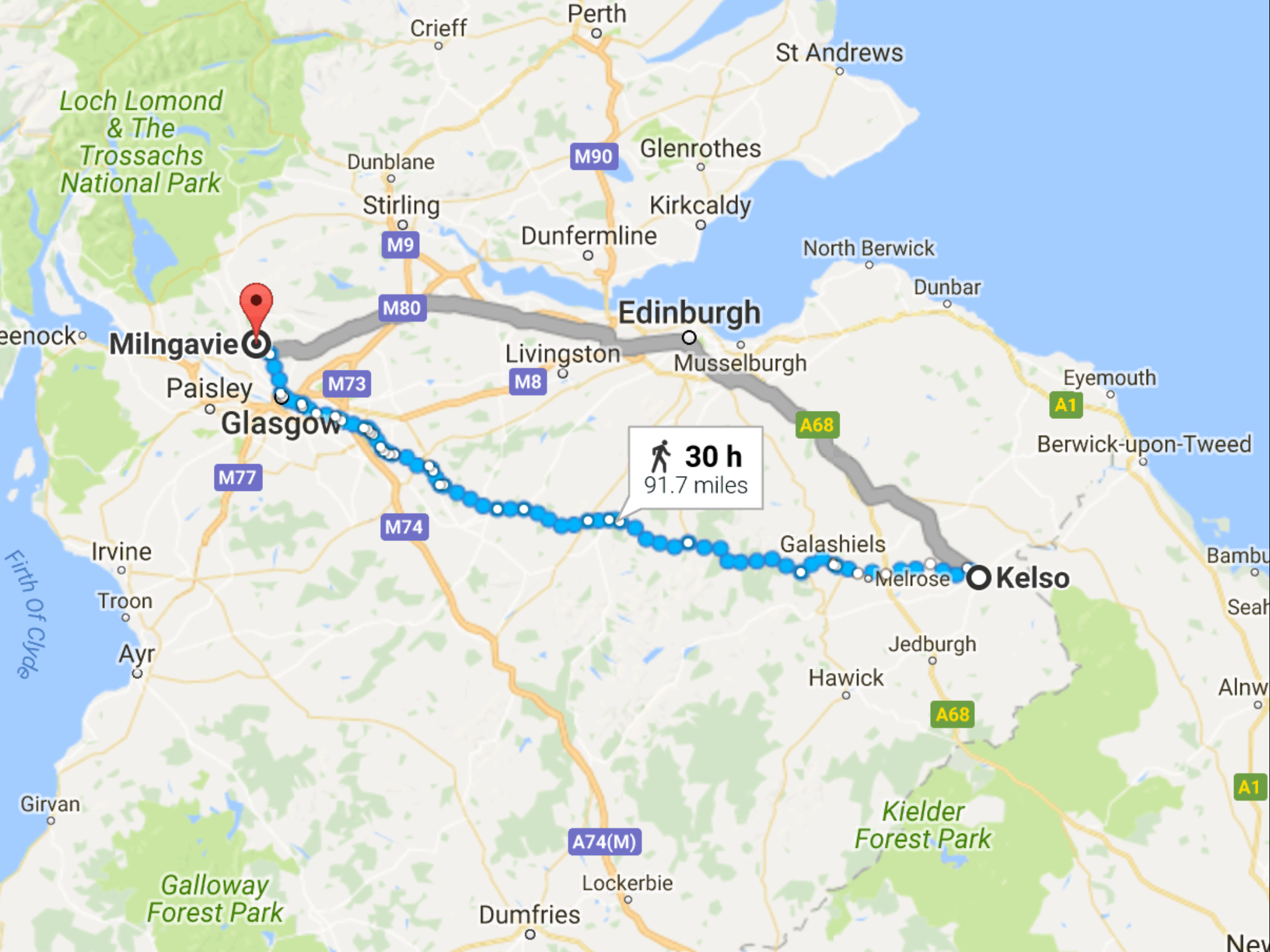Hello my darlings!! I’m walking again. In recent years I’ve walked from John O’Groats in the northwest to Cape Wrath in the northeast of Scotland. From Cape Wrath down to Milngavie, and now I’m walking from Milngavie (near Glasgow) to Kelso in the southeast of Scotland. Below is an approximate route but it’s actually longer than this. Just to give you some orientation.