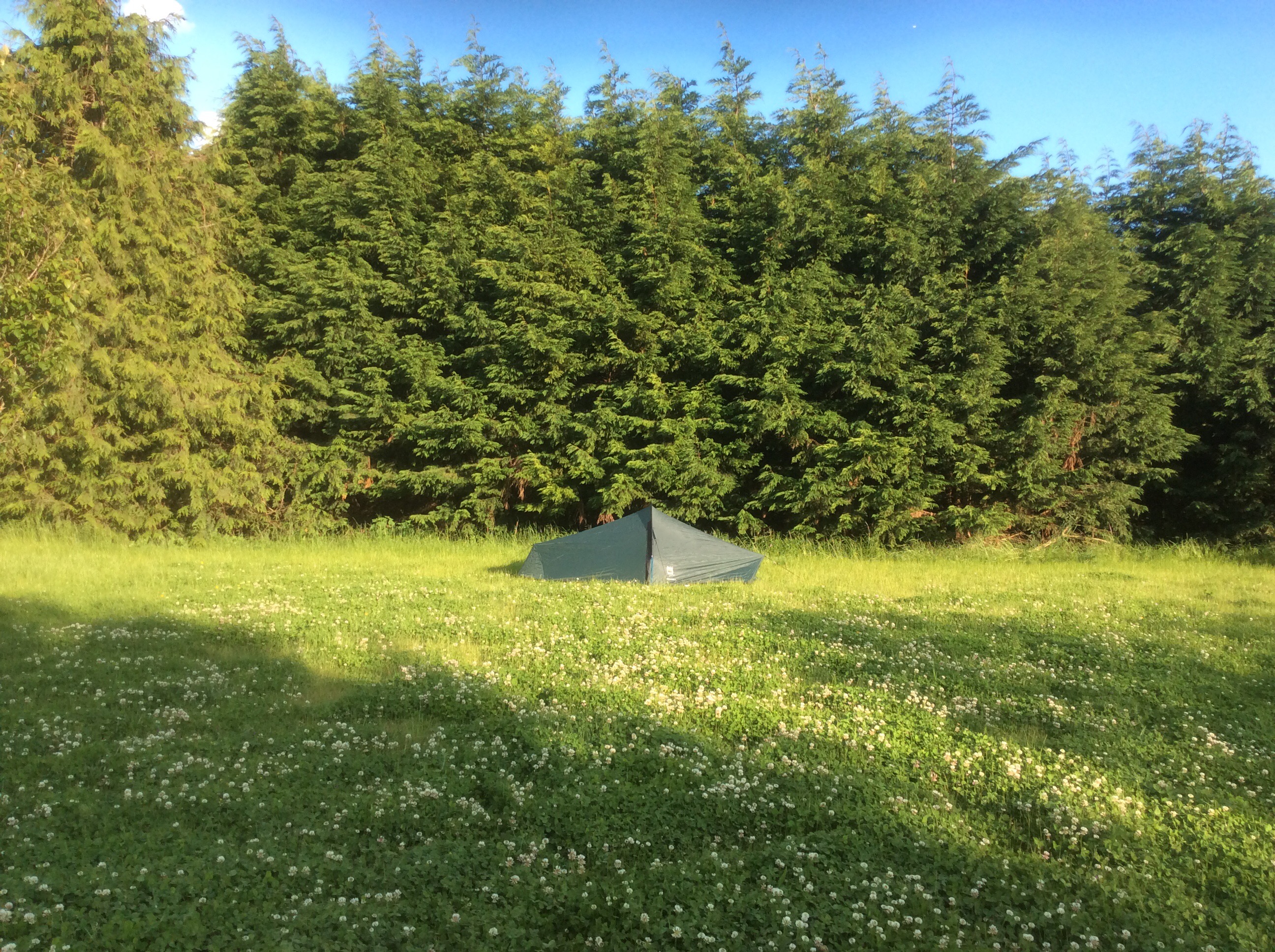 The tent was nestled up by a tall hedge, but the ground was rock hard and I don’t carry a mattress. So I slept badly. I had my tea before I got down.