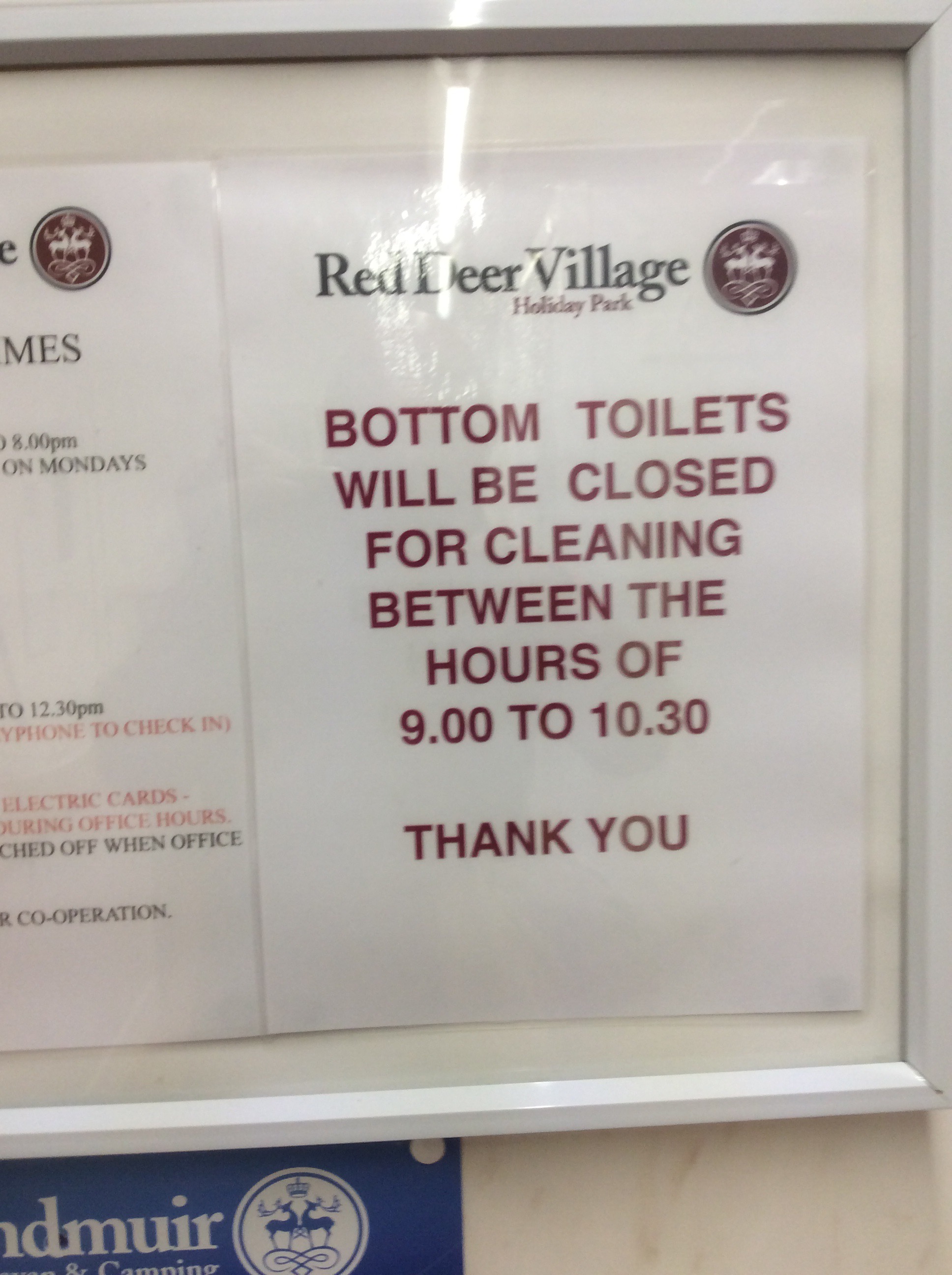 Dint see her. Saw a lot of cars though. Roadwalking again mostly today from east Glasgow south to Lanark. Twenty five miles it turned out to be. Knackered me. Sorry….Knackered, me. Anyway I went to bed early in ma tent last night. I couldn’t work out the signage in the bog, which was very clean, although I didn’t test the showers. Too tired. Anyway the sign was bizarre.