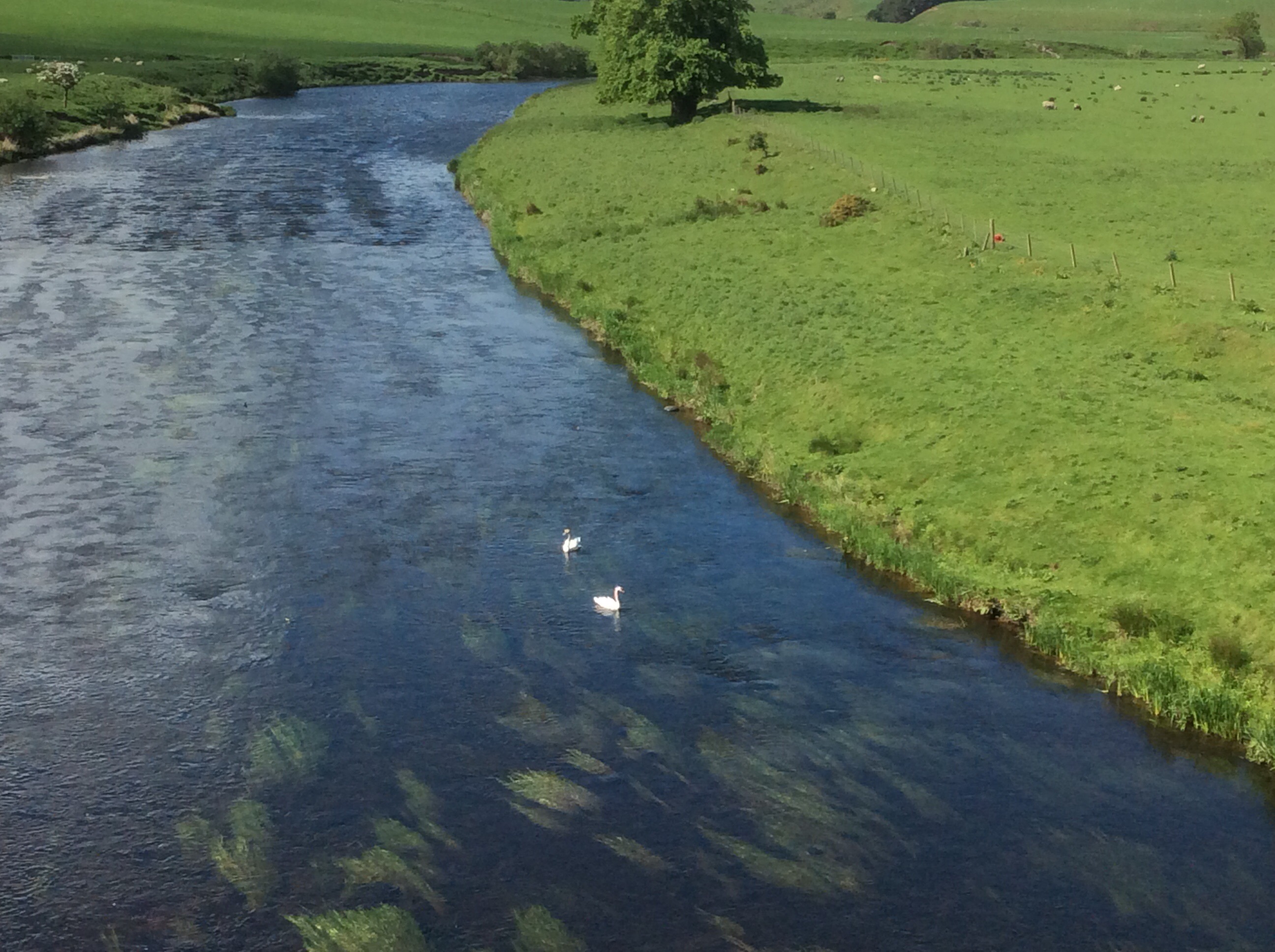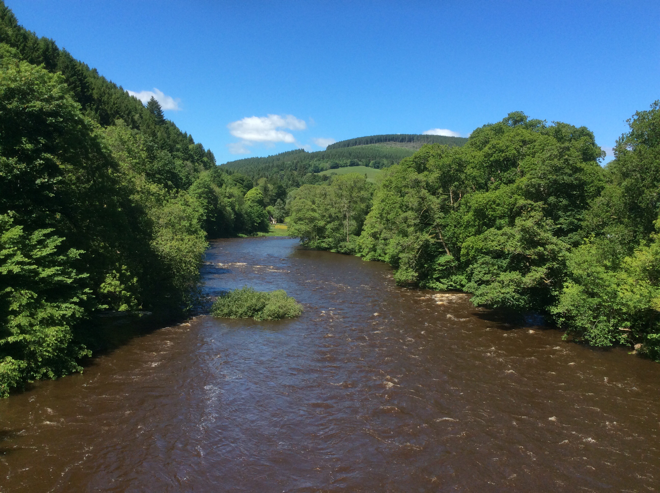 It isn’t but it would be ok if it was. Today was a 17 mile walk from the camp site in Biggar down alongside a stream to the River Tweed and on to Peebles. Biggar is a mile from the River Clyde, which runs on to Glasgow and down the Firth of Clyde to the Irish Sea and the Atlantic. But the stream that runs through Biggar turns left, instead of right, and runs on to the Tweed, which wends its way to England, the east coast and the North Sea.