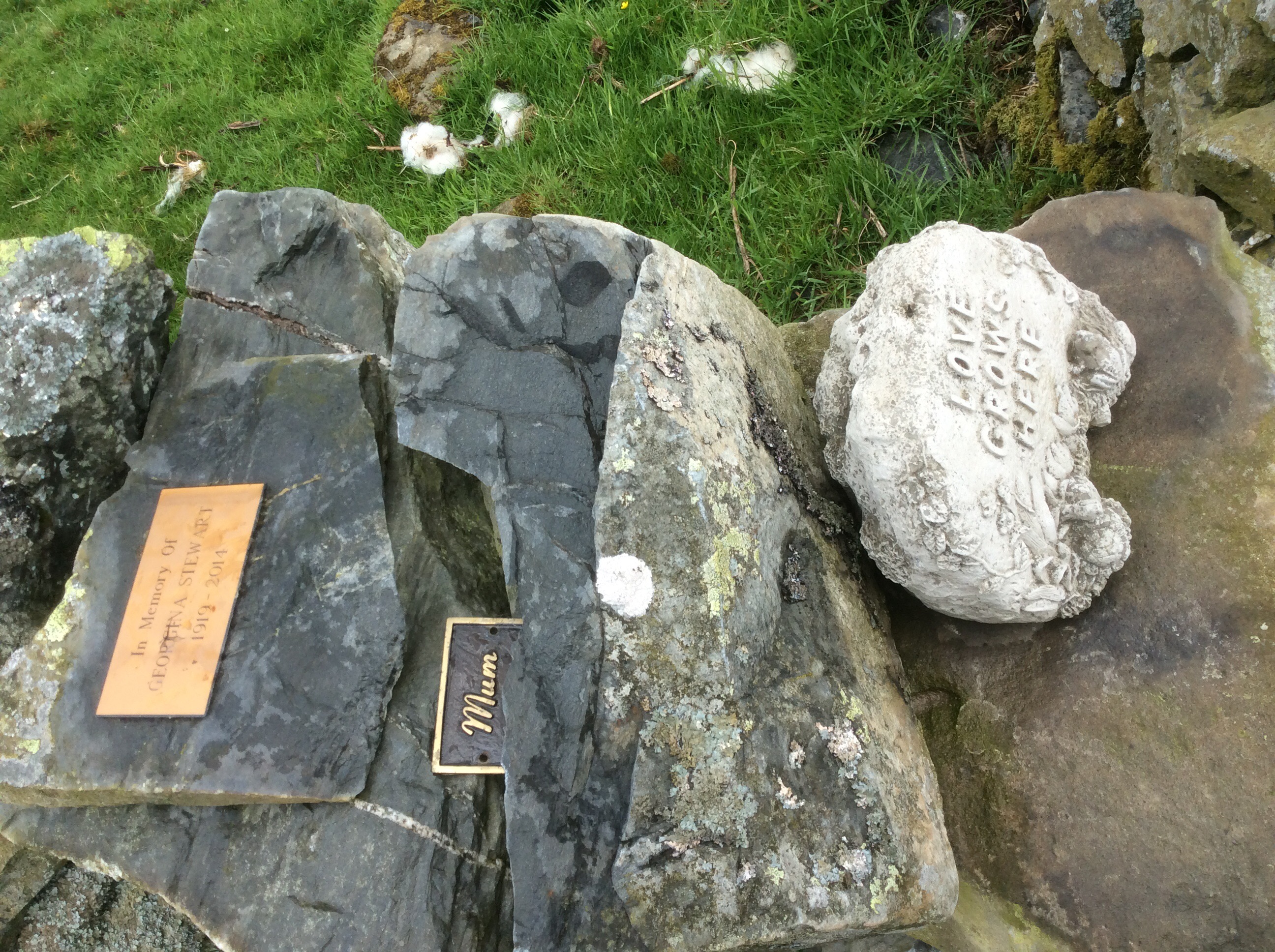 On top of one of the dry stone walls was an inscription and inscribed rocks. To Georgina Stewart, 1919 – 2014. A good innings and a lovely place to rest eternally.