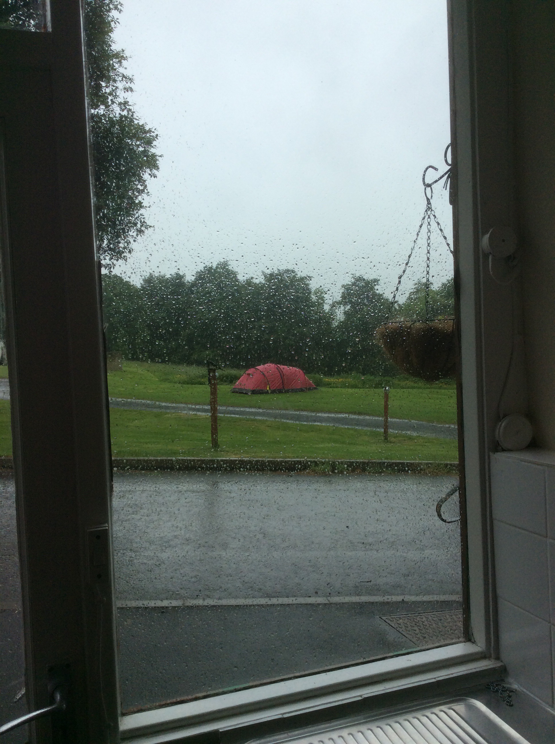 It rained a lot overnight, I woke up a few times but only peed once. I know you like to know these things. Keeping tabs on my bladder. That’s fine, I’m not sensitive about it. But I was in the sleeping bag when I did it. Hoots of laughter. The rain continued into the afternoon.