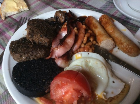 I wore my boots and walked just half a mile to a cafe recommended by the campsite. A great breakfast with double haggis and tea.
