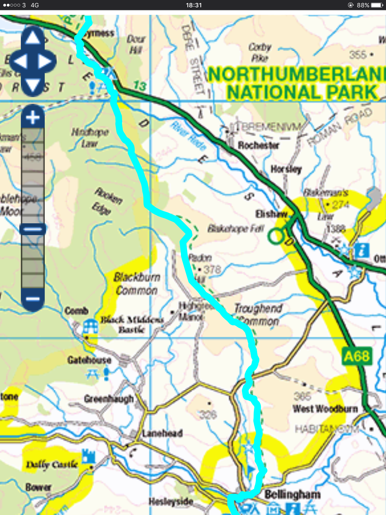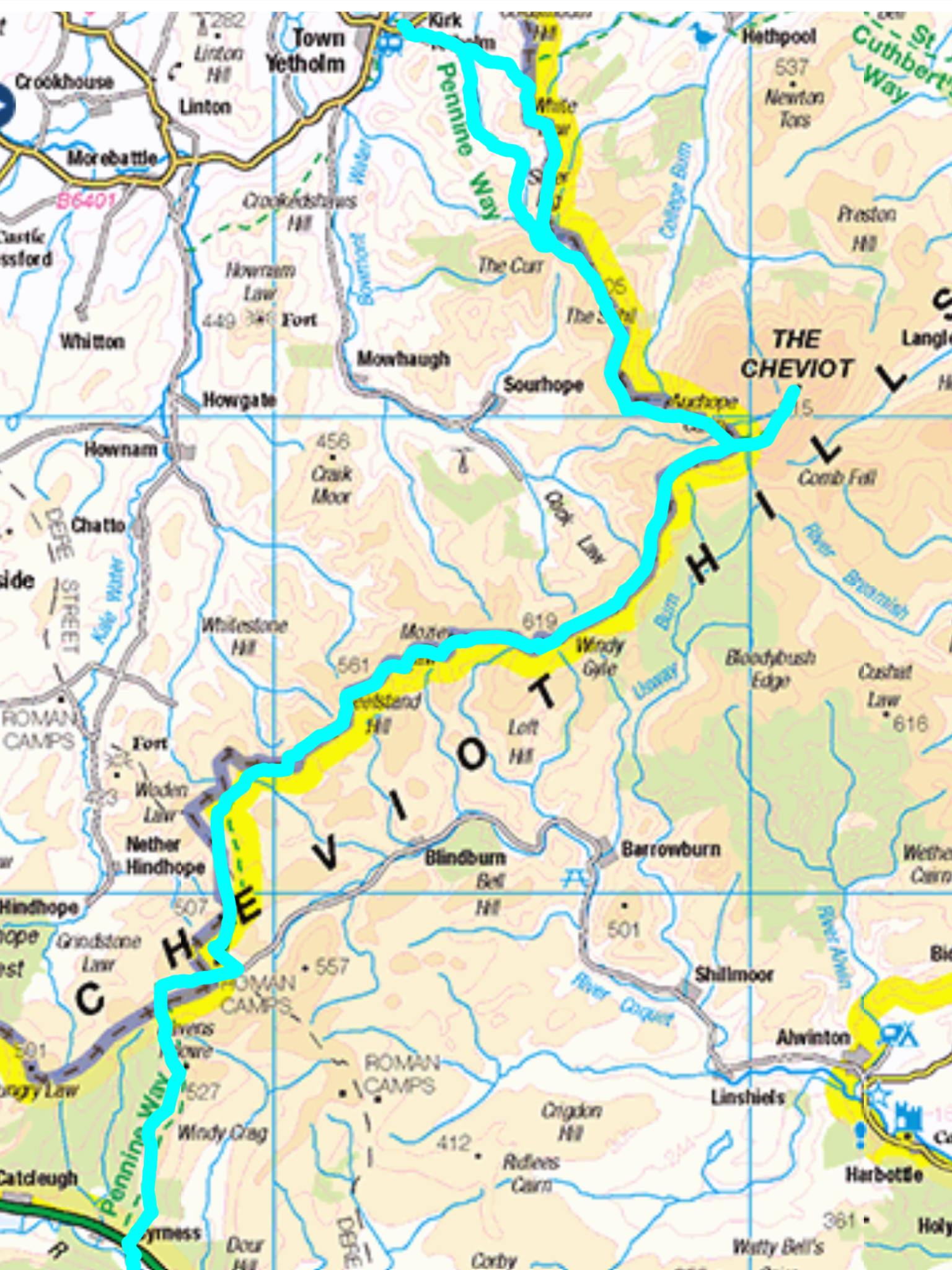 Christ it’s rained. These are the routes for the last two days, Kirk Yetholm to Byrness, and today, Byrness to Bellingham.