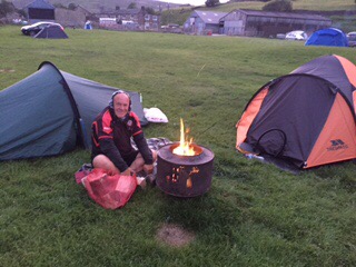 Then an early retreat to our tents and a bonfire outside, invaded by armies of midges. A little corner of Scotland in north England, land of the swarming midge, and Chip’s legs look like he’s got chicken pox. Poxy old get.