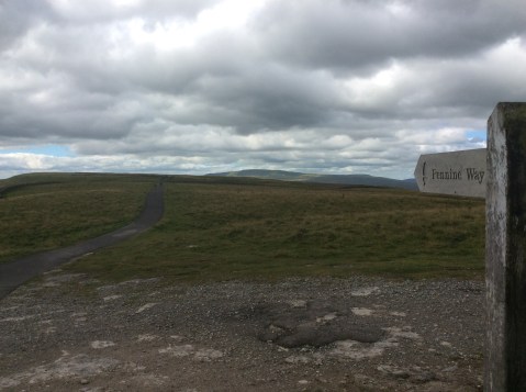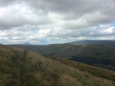 The south side drops steeply down and the Way traverses a couple of miles of moorland before pitching up the side of Fountains Fell. From this angle you can see Pen y Ghent and, to the left in the far distance, Ingleborough.