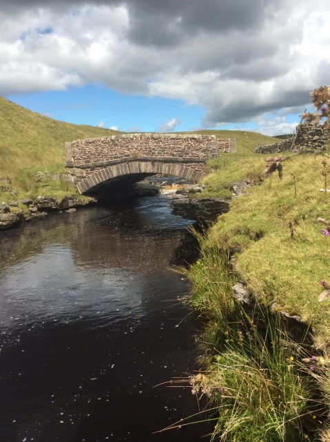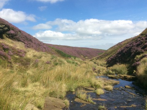 Onward and downward to a small stream spilling down the Moorside, with the purple heather in abundance in its late summer finery. It stoned me to my soul. Stoned me just like going home, and it stoned me.