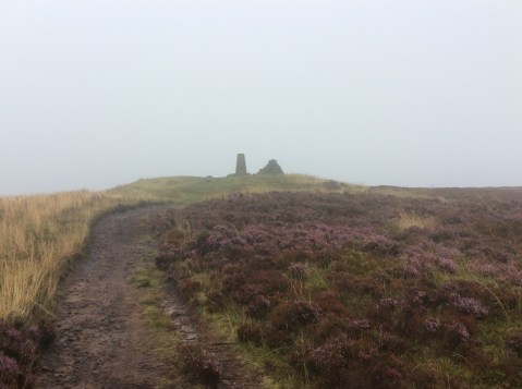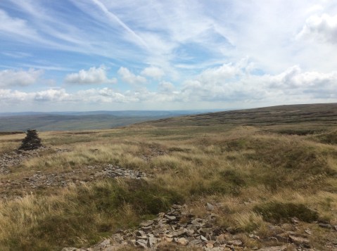 At long last we got to the top, and the wind was cruel and it started to rain. A 360 degree view from the third highest peak in Yorkshire and we were too cold and our fingers too numb to take photos. In August.