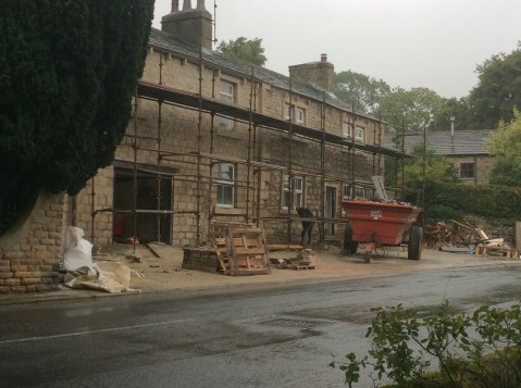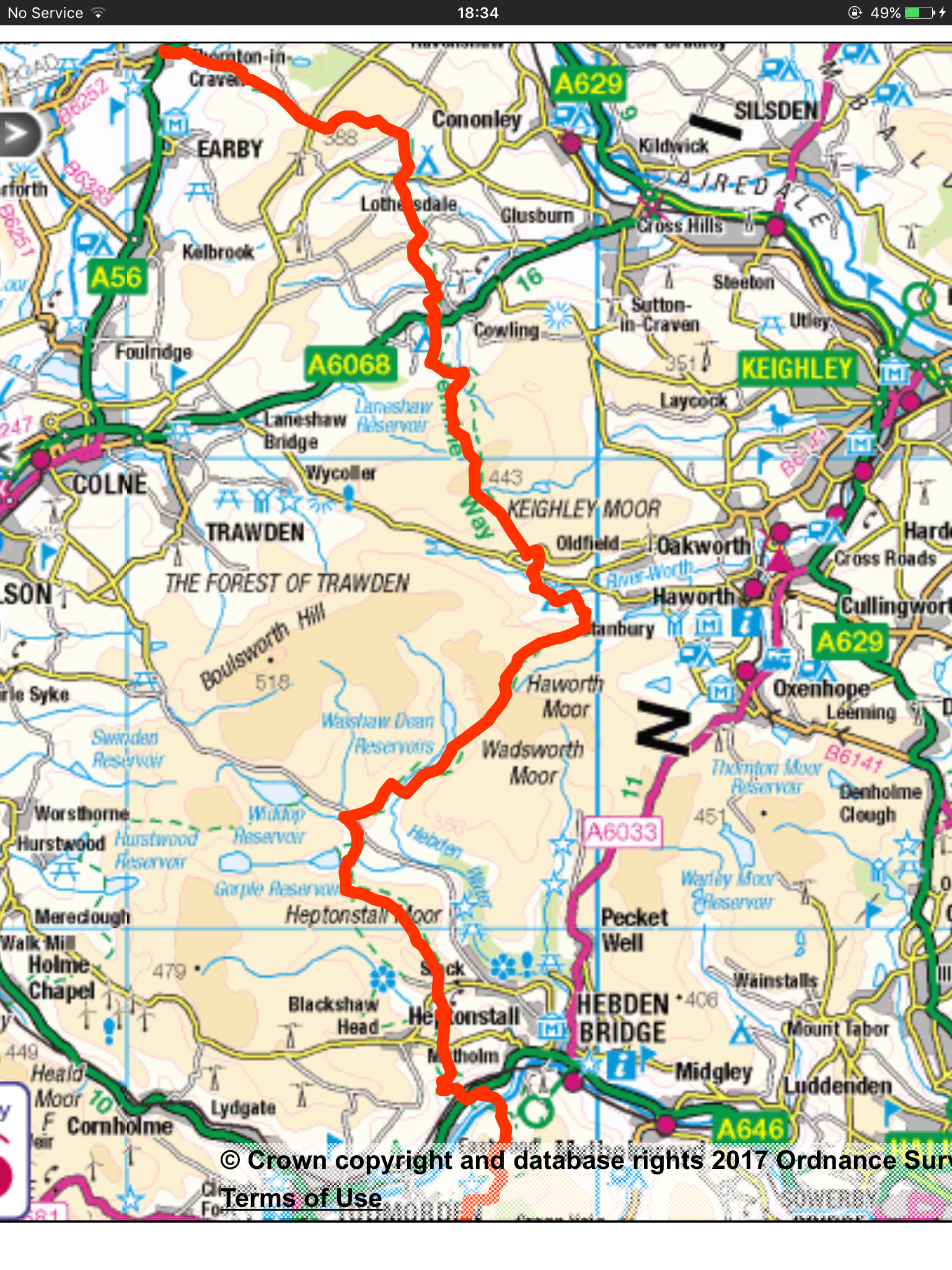 We got up early to get some bacon butties in Hebden Bridge and to drive on to where I left off in Lothersdale. The route today was through Bronte Country with wind-blasted moors and stark hillsides. Meandering 16 miles up hill and down dale to the rendezvous point, the New Delight Inn, Colden where we had spent last night camping in the back field. Debs – oh bugger it, everybody calls her Che – Che was dropping me off, coming back to Colden to derig my tent and push on to Marsden to put her own tent up, for me to sleep in. It’s big and comfortable. Marsden is one day ahead of where I’ll finish today but I’ll stay there for two nights. Means I don’t have to carry my rucksack for a day when Che’s gone. But she’ll take her tent with her and put my little one (tent) up.