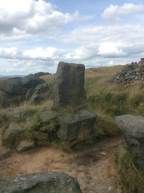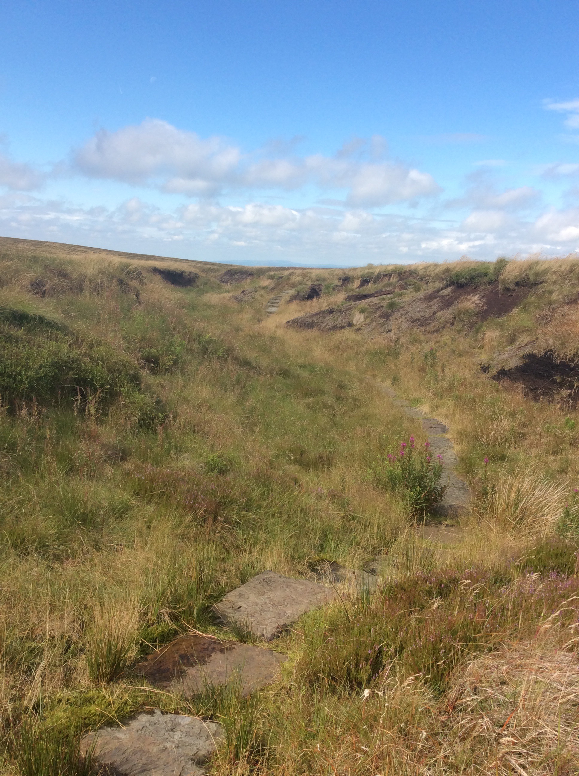 Here the Way turns southward and follows a ridge looking west towards Manchester, Liverpool and the Irish Sea, sadly out of range in the haze. At one point it cuts uphill eastwards along an old packhorse track with a 600 year old waymark stone marking the way. Well, course it does. If it was a skidmark stone it would mark the skid. It does what it says on the tin. Marks the way.