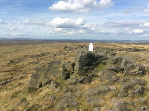Bleaklow is a flat peak, with a nominal summit of a cairn with a wooden stake sticking out of it. Wild and windy.