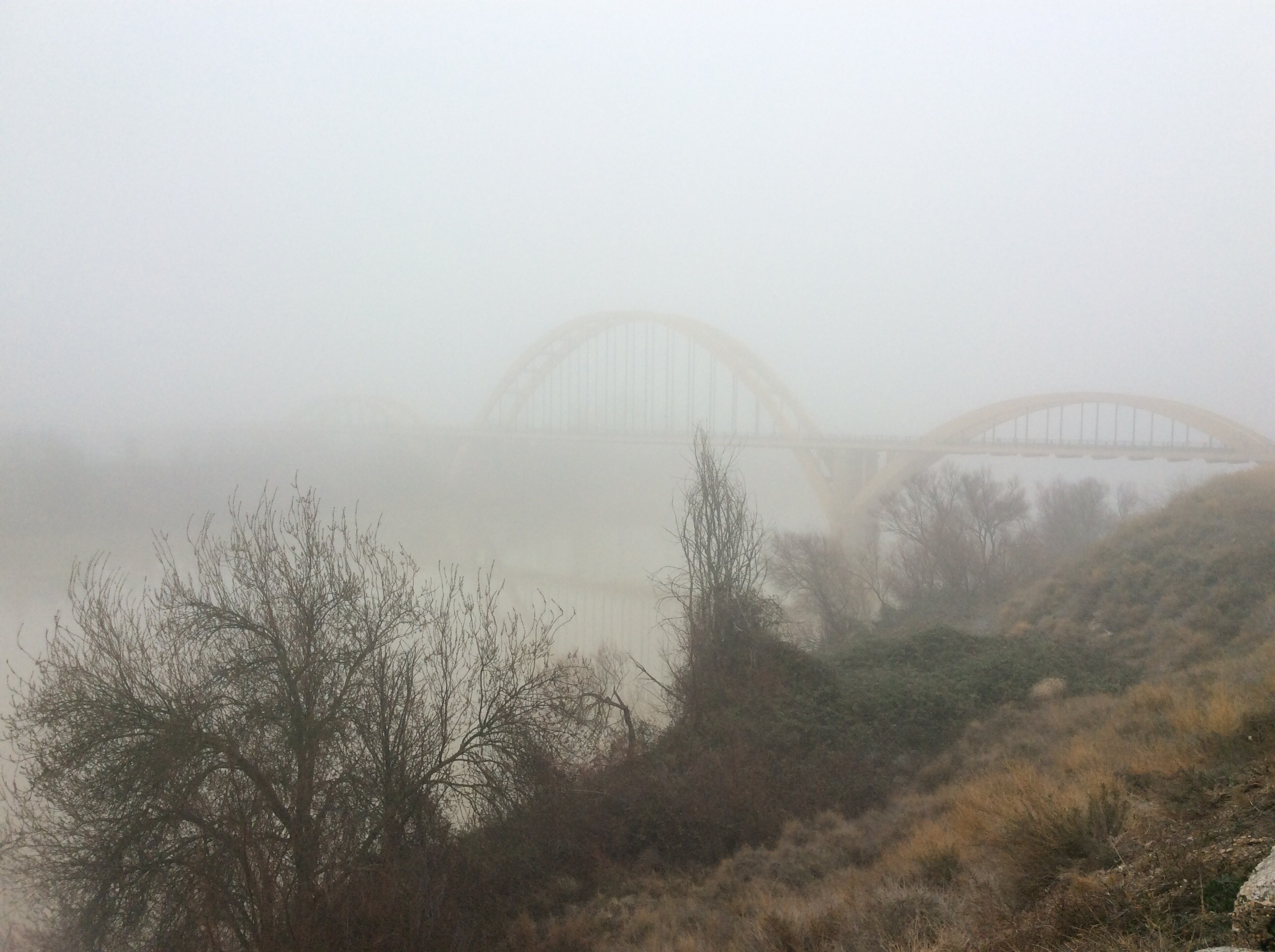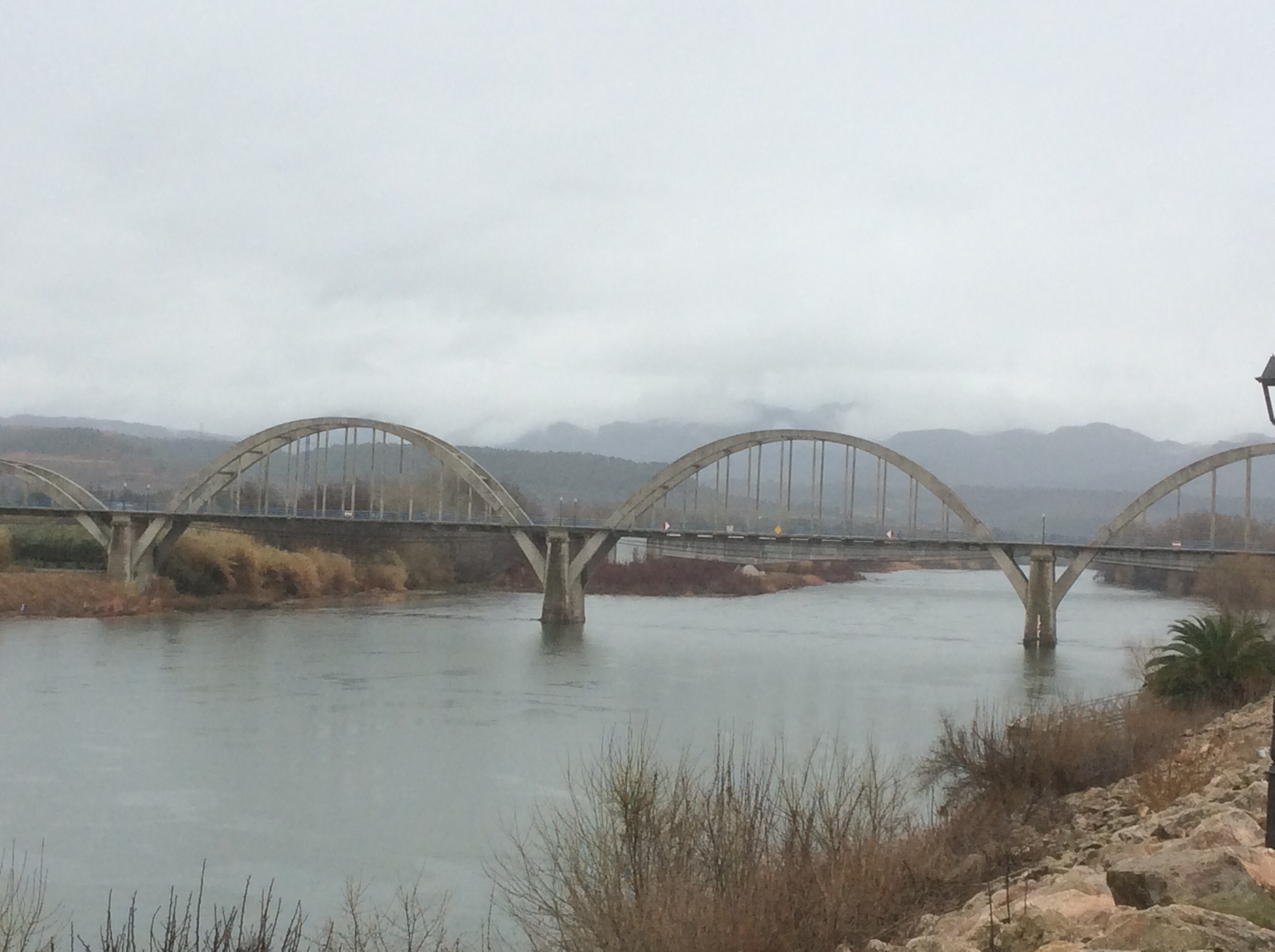 A good night’s sleep and waking up to a brand new day. Well, not exactly. It was freaking freezing, foggy and forlorn. A 17 mile route today on roads all the way, and we set off with intent and determination. And, after half a mile, stopped for breakfast at the bar by the river that we had eaten at last night. Coffee, orange juice, bread, chips and fried eggs. A winning combination that drives tired legs and painful feet! Crossing the Ebro, up and over the hills and down to Sastago. We made good time, wrapped up in warm clothing, which for me included gloves, scarf, jumper and hat. Dropping down we came upon the river.